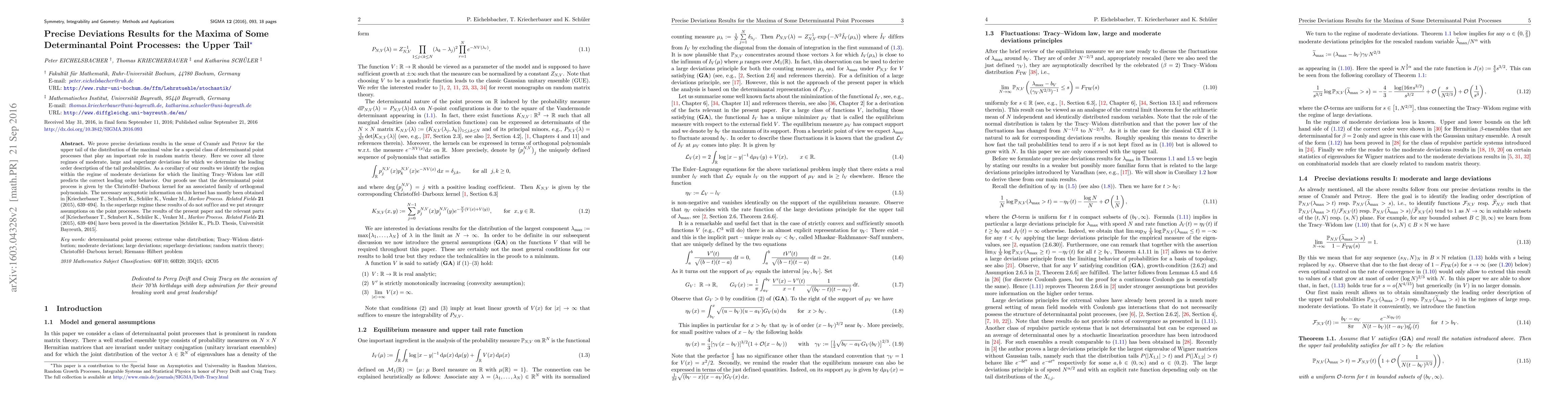 This paper proves precise deviations results for the upper tail of the maximal value in determinantal point processes, covering moderate, large, and superlarge deviation regimes. It identifies the region within moderate deviations where the Tracy-Widom law holds, using the Christoffel-Darboux kernel and associated orthogonal polynomials for proofs.