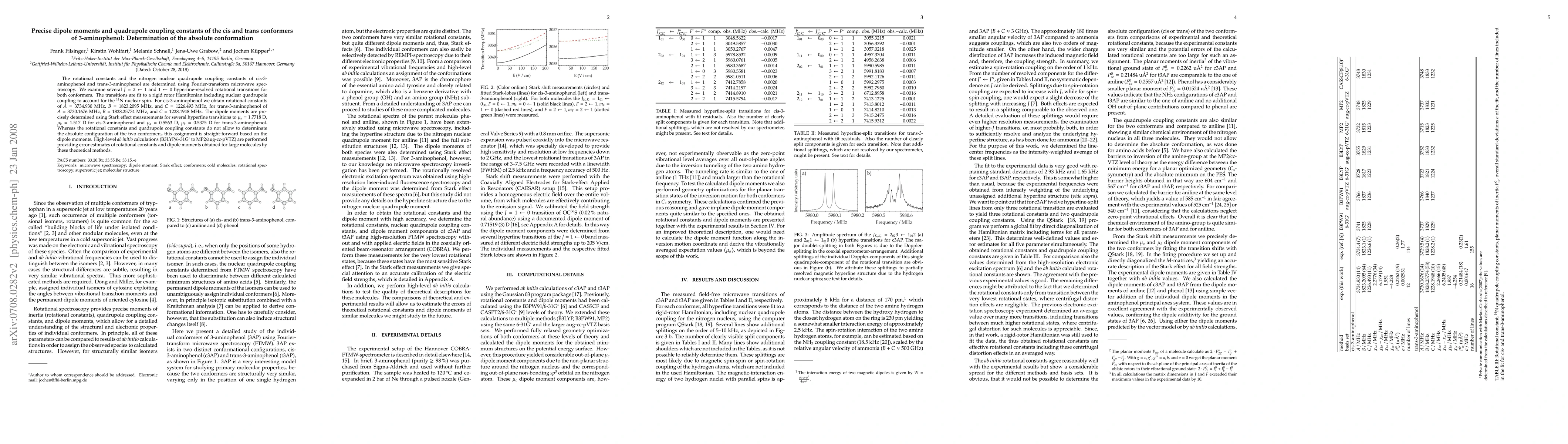 This study uses Fourier-transform microwave spectroscopy to determine the rotational constants and nitrogen nuclear quadrupole coupling constants of cis- and trans-3-aminophenol. Precise dipole moments and absolute conformations are identified via Stark effect measurements, confirming the cis conformer has larger dipole moments than the trans conformer.
