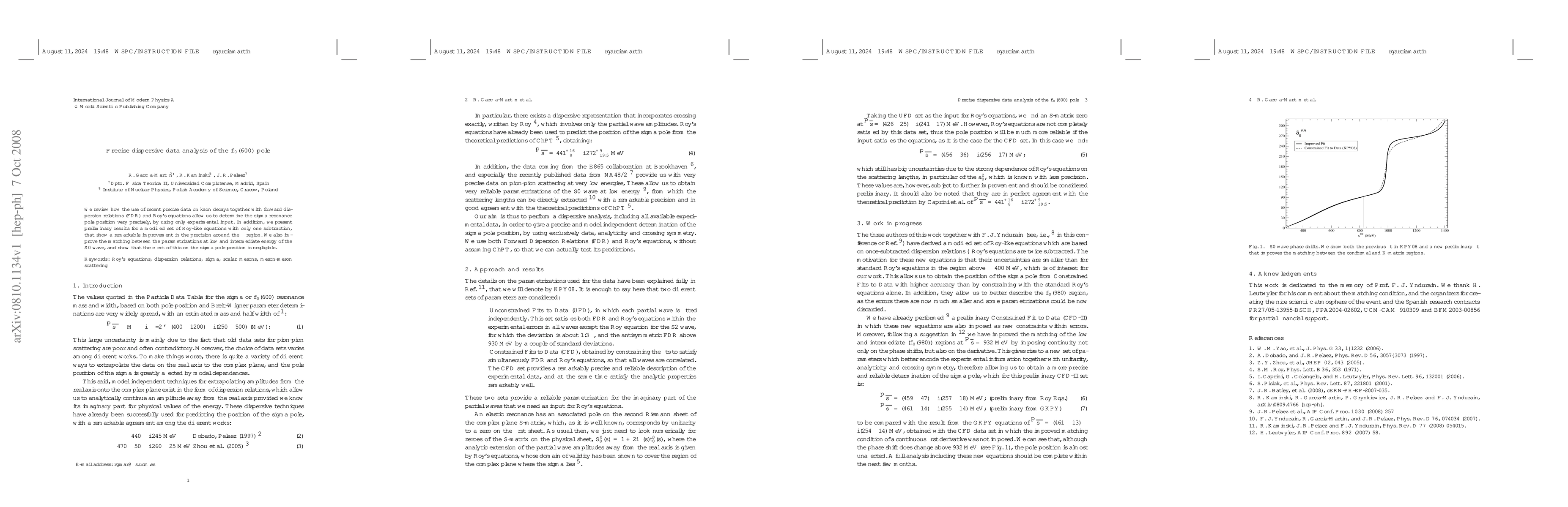 We review how the use of recent precise data on kaon decays together with forward dispersion relations (FDR) and Roy's equations allow us to determine the sigma resonance pole position very precisely, by using only experimental input. In addition, we present preliminary results for a modified set of Roy-like equations with only one subtraction, that show a remarkable improvement in the precision around the sigma region. We also improve the matching between the parametrizations at low and intermediate energy of the S0 wave, and show that the effect of this on the sigma pole position is negligible.
