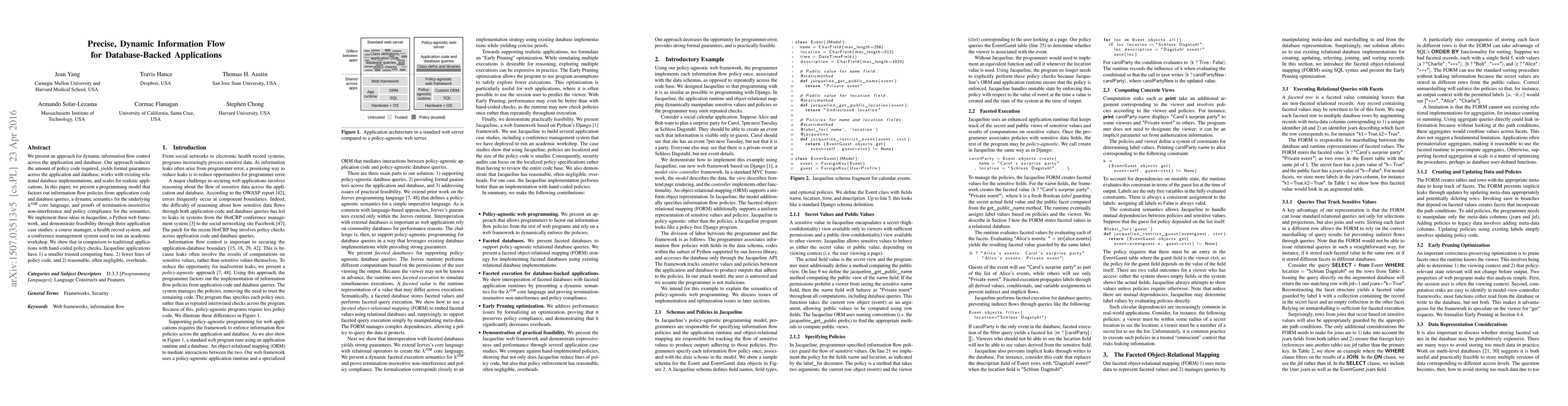 This paper introduces a dynamic information flow control approach for database-backed applications, reducing policy code and ensuring formal guarantees. Implemented in Jacqueline, a Python web framework, it demonstrates smaller trusted computing bases and fewer policy lines compared to traditional methods.