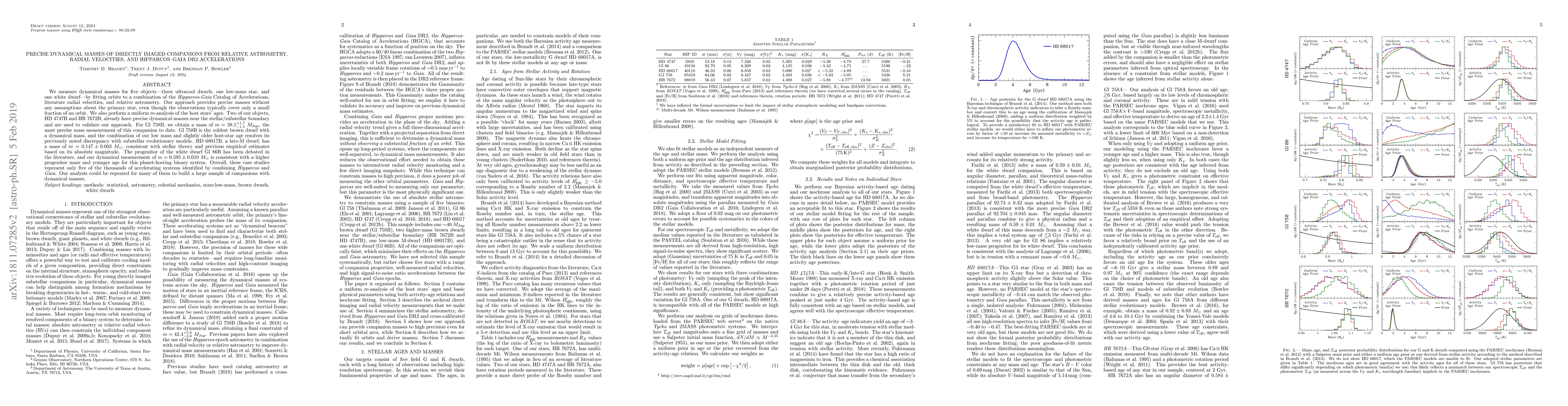 This paper measures precise dynamical masses for five directly imaged companions using relative astrometry, radial velocities, and Hipparcos-Gaia DR2 accelerations, providing accurate masses without assumptions about the primary star. The study validates the method with two known objects and presents the most precise mass measurement to date for Gl 758B, resolving its evolutionary model discrepancy.