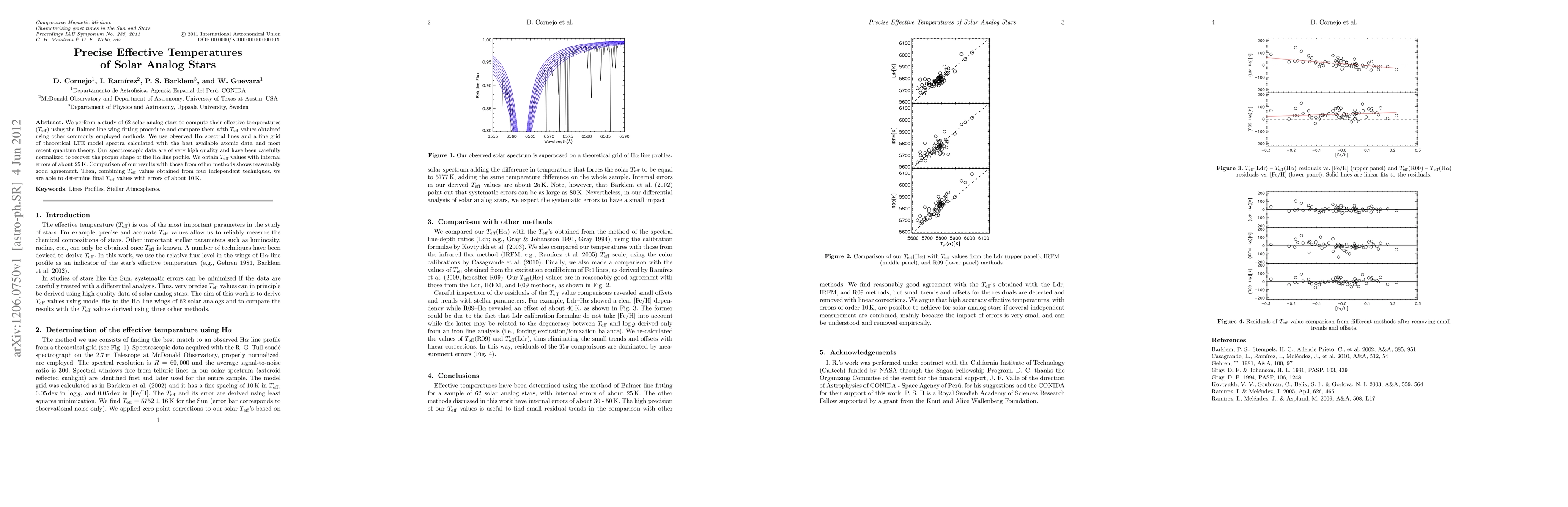 We perform a study of 62 solar analog stars to compute their effective temperatures (Teff) using the Balmer line wing fitting procedure and compare them with Teff values obtained using other commonly employed methods. We use observed H-alpha spectral lines and a fine grid of theoretical LTE model spectra calculated with the best available atomic data and most recent quantum theory. Our spectroscopic data are of very high quality and have been carefully normalized to recover the proper shape of the H-alpha line profile. We obtain Teff values with internal errors of about 25 K. Comparison of our results with those from other methods shows reasonably good agreement. Then, combining Teff values obtained from four independent techniques, we are able to determine final Teff values with errors of about 10 K.
