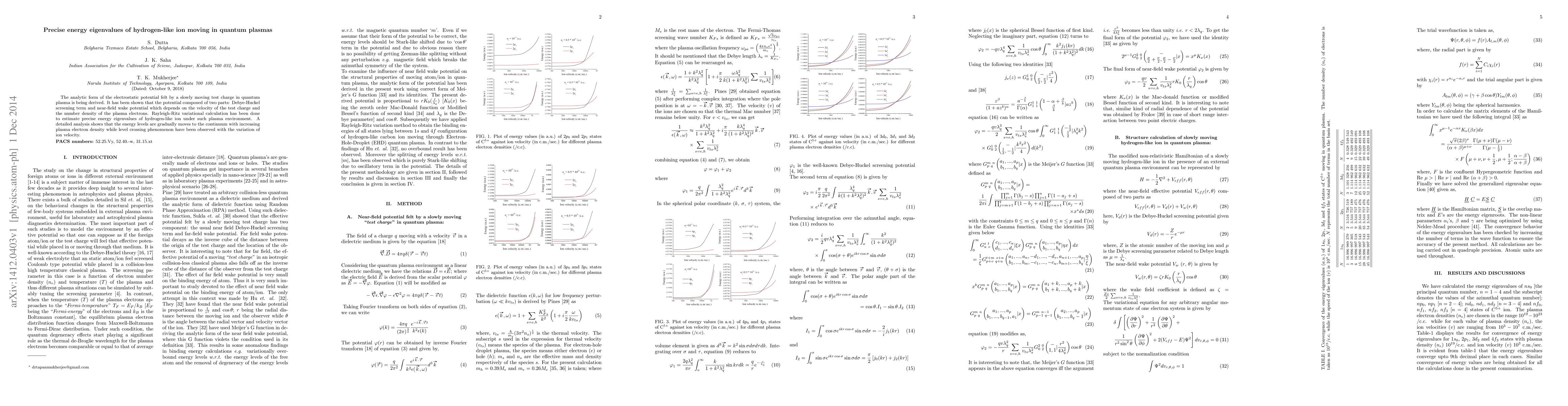 The analytic form of the electrostatic potential felt by a slowly moving test charge in quantum plasma is being derived. It has been shown that the potential composed of two parts: Debye-Huckel screening term and near-field wake potential which depends on the velocity of the test charge and the number density of the plasma electrons. Rayleigh-Ritz variational calculation has been done to estimate precise energy eigenvalues of hydrogen-like ion under such plasma environment. A detailed analysis shows that the energy levels are gradually moves to the continuum with increasing plasma electron density while level crossing phenomenon have been observed with the variation of ion velocity.