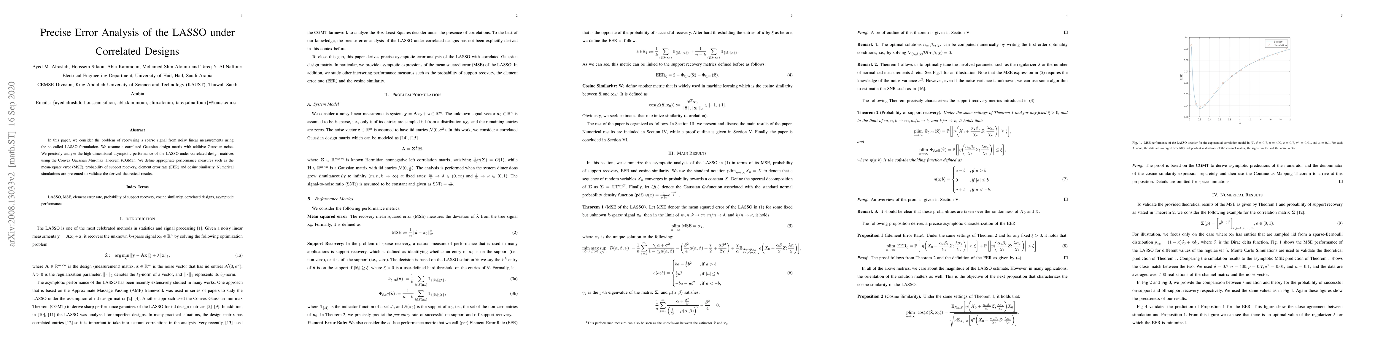 In this paper, we consider the problem of recovering a sparse signal from noisy linear measurements using the so called LASSO formulation. We assume a correlated Gaussian design matrix with additive Gaussian noise. We precisely analyze the high dimensional asymptotic performance of the LASSO under correlated design matrices using the Convex Gaussian Min-max Theorem (CGMT). We define appropriate performance measures such as the mean-square error (MSE), probability of support recovery, element error rate (EER) and cosine similarity. Numerical simulations are presented to validate the derived theoretical results.