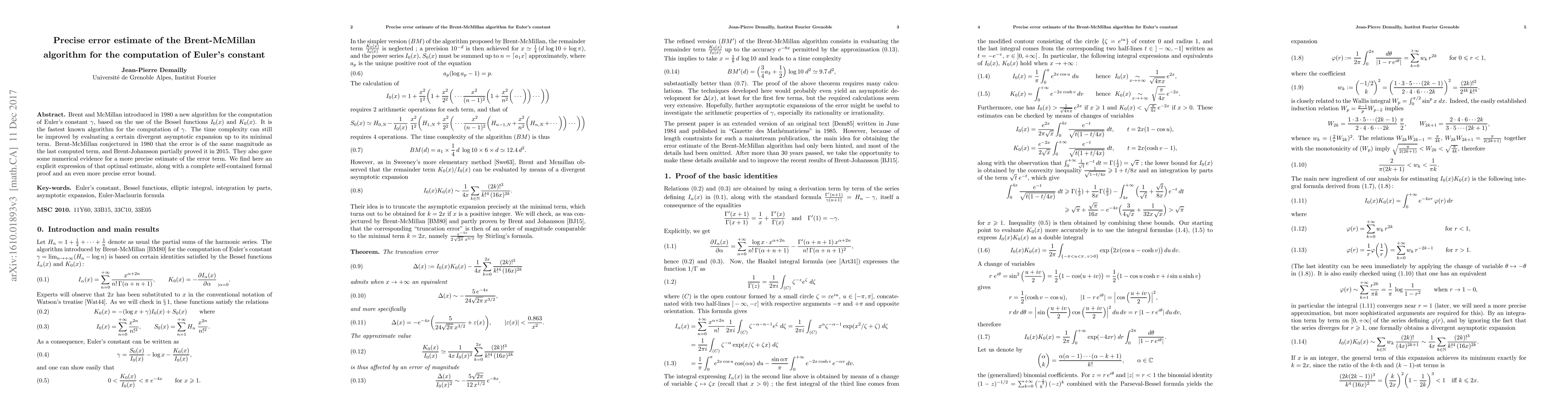Brent and McMillan introduced in 1980 a new algorithm for the computation of Euler's constant $\gamma$, based on the use of the Bessel functions I\_0(x) and K\_0(x). It is the fastest known algorithm for the computation of $\gamma$. The time complexity can still be improved by evaluating a certain divergent asymptotic expansion up to its minimal term. Brent-McMillan conjectured in 1980 that the error is of the same magnitude as the last computed term, and Brent-Johansson partially proved it in 2015. They also gave some numerical evidence for a more precise estimate of the error term. We find here an explicit expression of that optimal estimate, along with a complete self-contained formal proof and an even more precise error bound.
