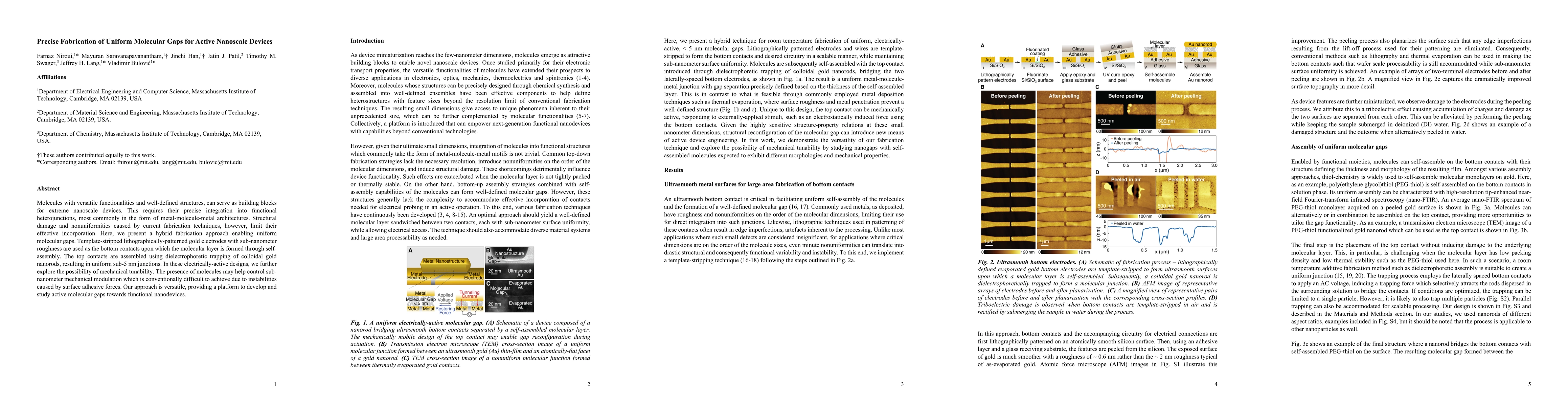 This paper presents a hybrid fabrication method to create uniform molecular gaps in nanoscale devices using self-assembly and dielectrophoretic trapping, achieving sub-5 nm junctions and exploring mechanical tunability for active nanodevices. The method employs template-stripped gold electrodes and colloidal gold nanorods to avoid structural damage.