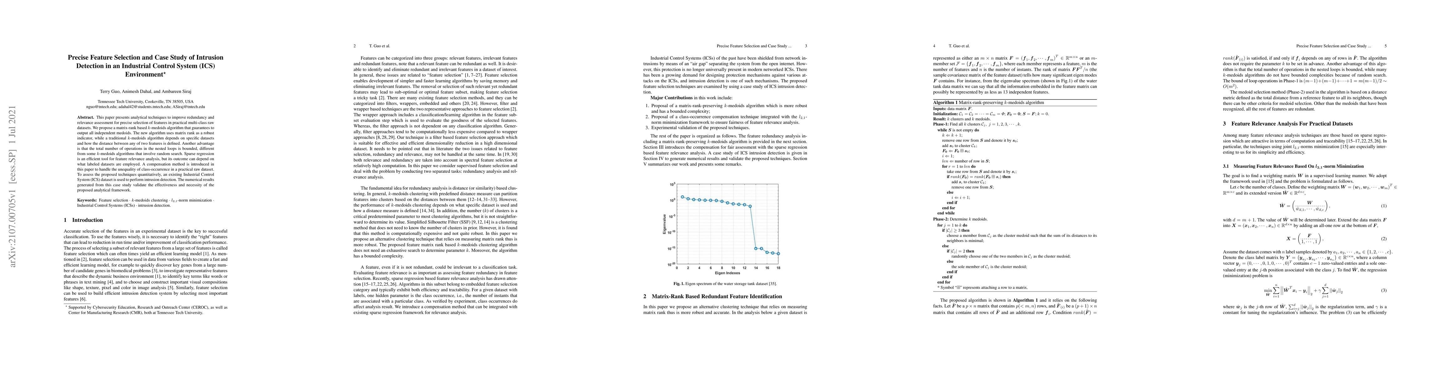 This paper presents analytical techniques to improve redundancy and relevance assessment for precise selection of features in practical multi-class raw datasets. We propose a matrix-rank based $k$-medoids algorithm that guarantees to output all independent medoids. The new algorithm uses matrix rank as a robust indicator, while a traditional $k$-medoids algorithm depends on specific datasets and how the distance between any of two features is defined. Another advantage is that the total number of operations in the nested loops is bounded, different from some $k$-medoids algorithms that involve random search. Sparse regression is an efficient tool for feature relevance analysis, but its outcome can depend on what labeled datasets are employed. A compensation method is introduced in this paper to handle the unequality of class-occurrence in a practical raw dataset. To assess the proposed techniques quantitatively, an existing Industrial Control System (ICS) dataset is used to perform intrusion detection. The numerical results generated from this case study validate the effectiveness and necessity of the proposed analytical framework.
