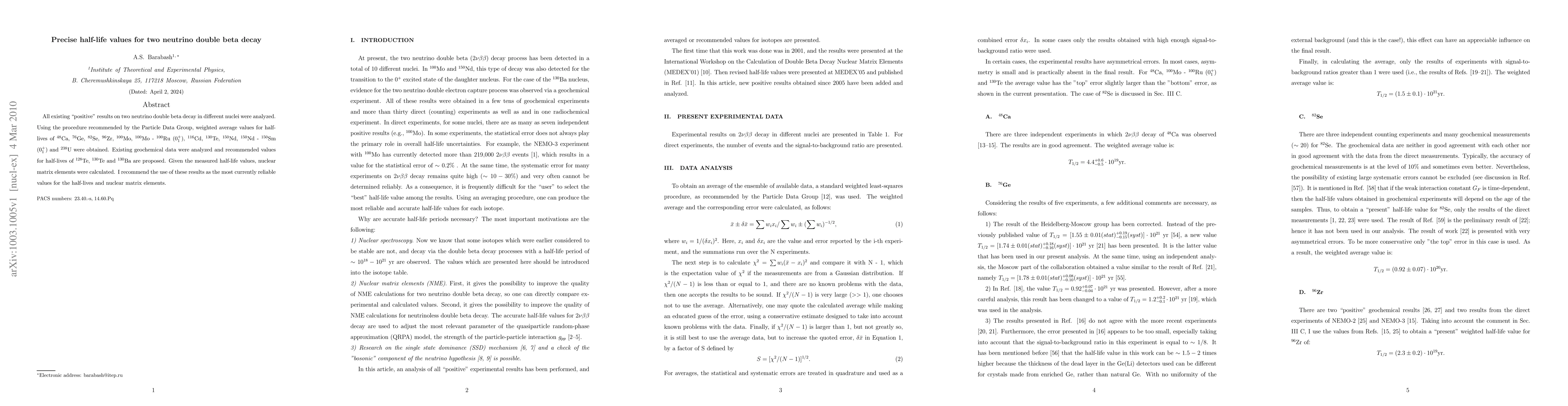 This paper presents precise half-life values for two neutrino double beta decay in various nuclei, using a method recommended by the Particle Data Group. It also proposes new half-life values for certain nuclei based on geochemical data and calculates nuclear matrix elements from the measured half-life values. The findings are suggested as the most reliable values currently available.