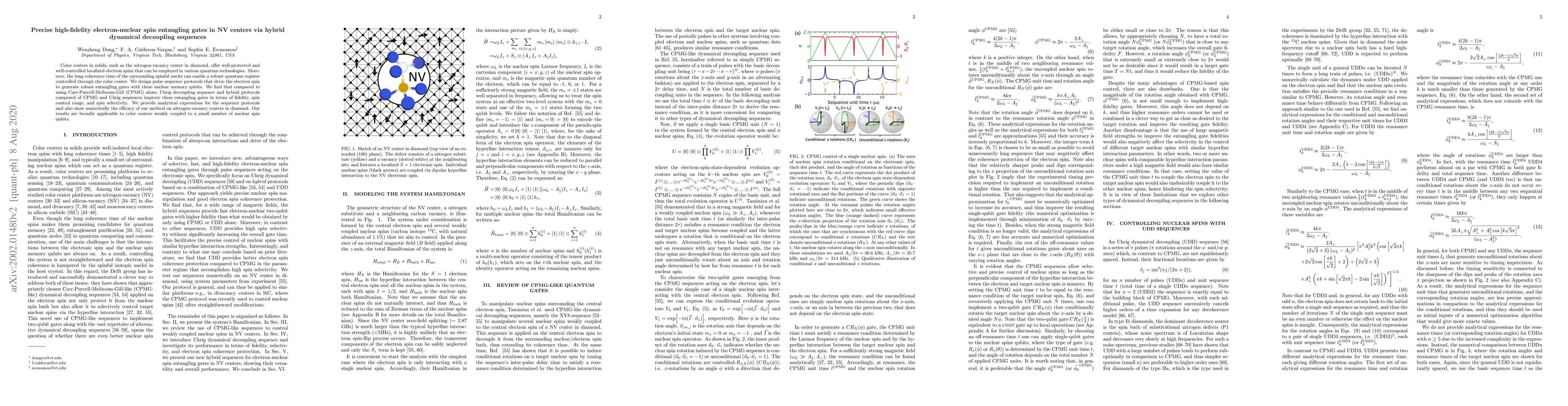 This paper presents hybrid dynamical decoupling sequences for achieving high-fidelity entangling gates between electron spins in NV centers and nuclear spins in diamond. The proposed hybrid protocols, combining CPMG and Uhrig sequences, outperform traditional CPMG alone in terms of fidelity, spin control range, and selectivity.