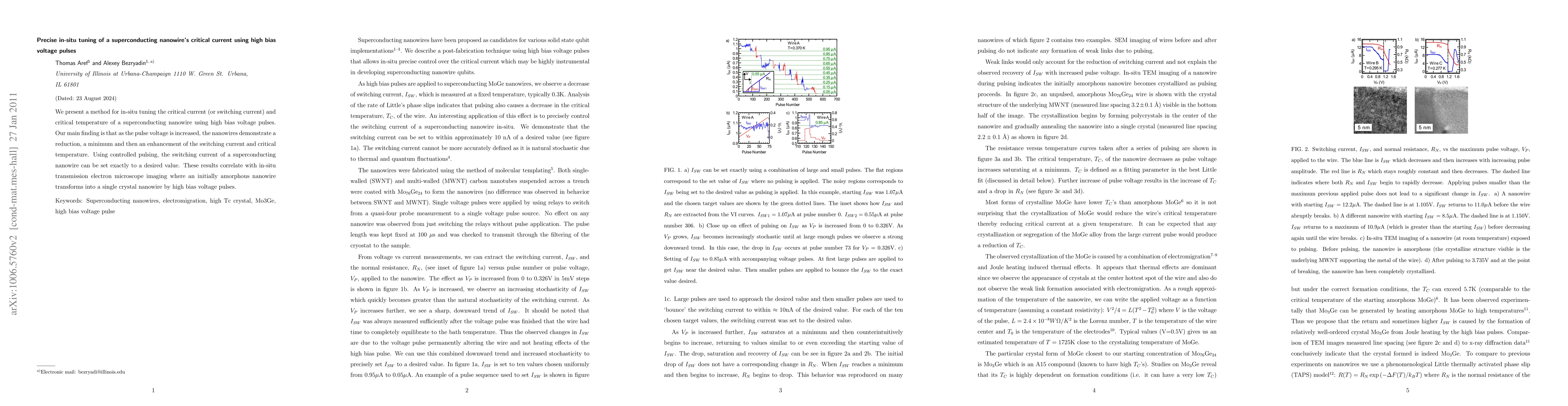 This paper introduces a technique to precisely adjust the critical current and temperature of a superconducting nanowire via high bias voltage pulses, showing a reduction, minimum, and subsequent enhancement of these properties. Controlled pulsing allows setting the switching current to a desired level, correlating with the transformation from amorphous to crystalline structure observed via in-situ transmission electron microscopy.