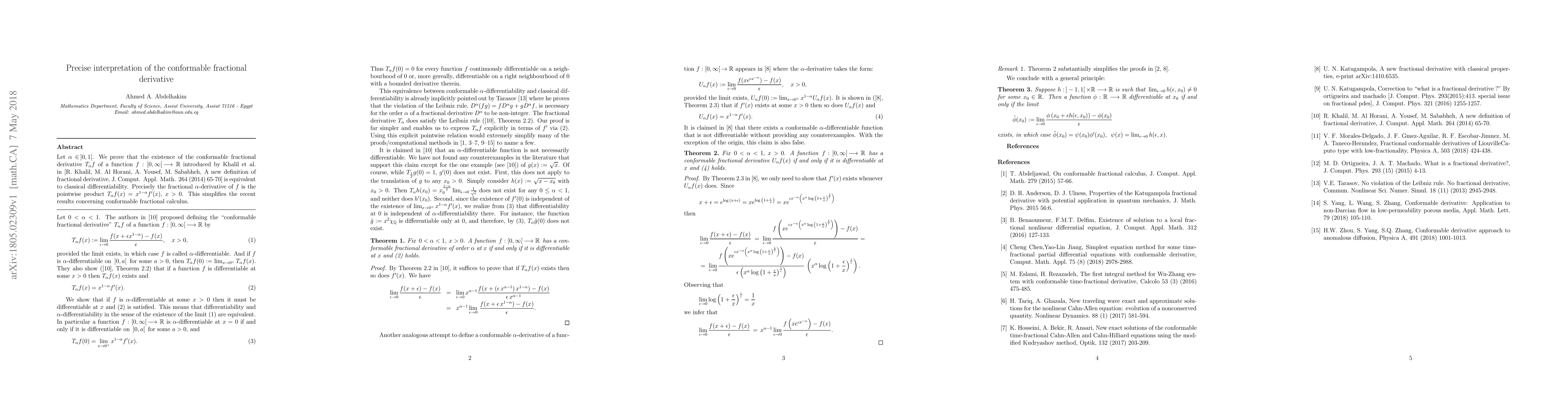 This paper proves that the existence of the conformable fractional derivative $T_{\alpha}f$ for a function $f$ is equivalent to classical differentiability, with the fractional $\alpha$-derivative being $T_{\alpha}f(x)=x^{1-\alpha}f^{\prime}(x)$ for $x>0$. This clarifies recent results in conformable fractional calculus.