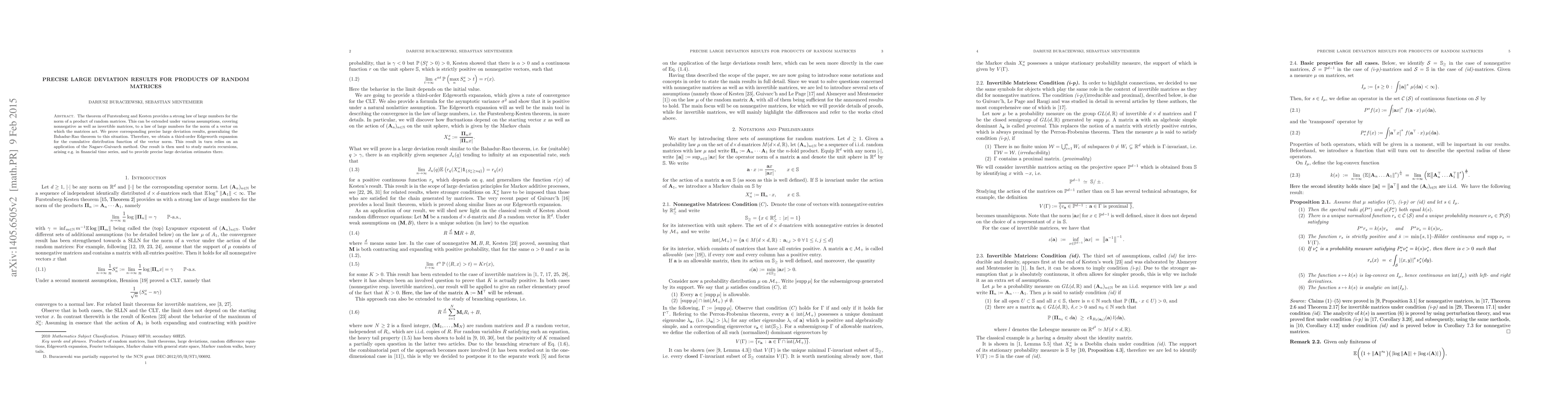 This paper extends the Furstenberg and Kesten theorem to derive precise large deviation results for products of random matrices, achieving a third-order Edgeworth expansion for the vector norm. The findings are applied to matrix recursions, offering precise large deviation estimates in financial time series.
