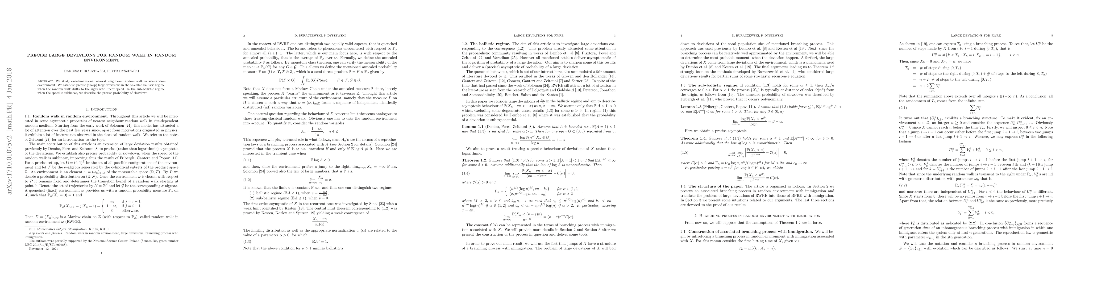 This paper investigates the precise large deviations for a one-dimensional random walk in a random environment, establishing sharp results in the ballistic regime where the walk moves linearly to the right, and detailing the exact probability of slowdown in the sub-ballistic regime with sublinear speed.