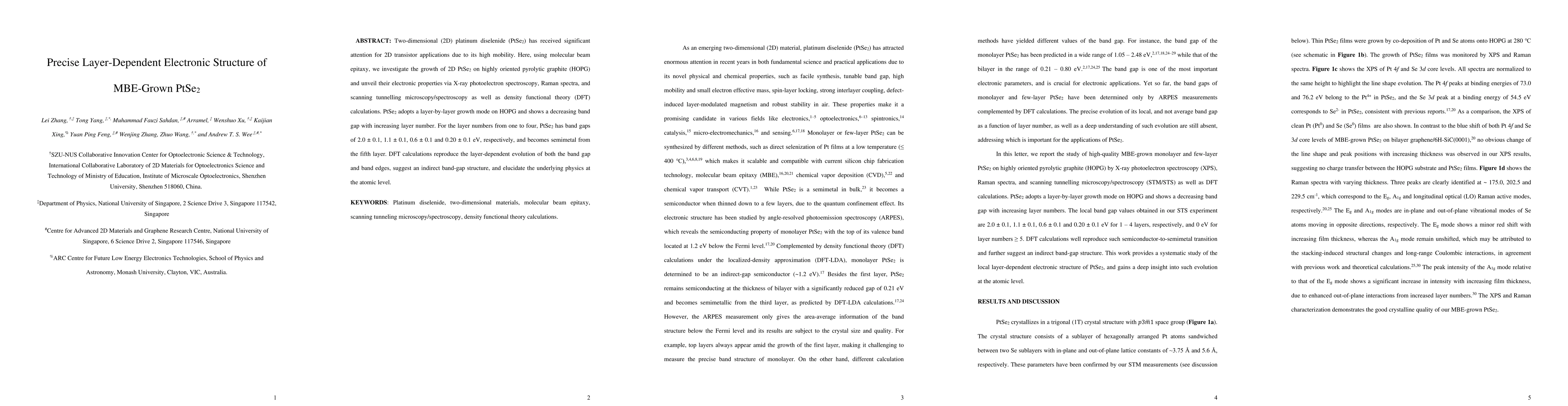 Two-dimensional (2D) platinum diselenide (PtSe$_2$) has received significant attention for 2D transistor applications due to its high mobility. Here, using molecular beam epitaxy, we investigate the growth of 2D PtSe$_2$ on highly oriented pyrolytic graphite (HOPG) and unveil their electronic properties via X-ray photoelectron spectroscopy, Raman spectra, and scanning tunnelling microscopy/spectroscopy as well as density functional theory (DFT) calculations. PtSe$_2$ adopts a layer-by-layer growth mode on HOPG and shows a decreasing band gap with increasing layer number. For the layer numbers from one to four, PtSe$_2$ has band gaps of $2.0 \pm 0.1$, $1.1 \pm 0.1$, $0.6 \pm 0.1$ and $0.20 \pm 0.1$ eV, respectively, and becomes semimetal from the fifth layer. DFT calculations reproduce the layer-dependent evolution of both the band gap and band edges, suggest an indirect band-gap structure, and elucidate the underlying physics at the atomic level.