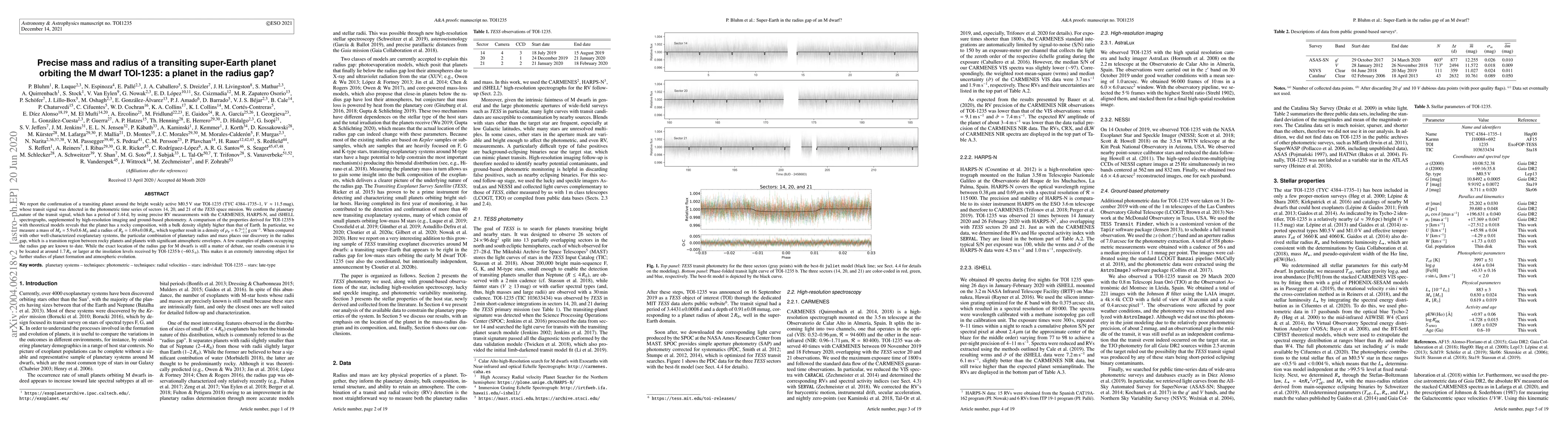 The discovery of a transiting super-Earth planet orbiting an M dwarf star, TOI-1235, reveals a rocky composition with a mass 5.9 times that of Earth and a radius 1.69 times that of our planet, placing it in the 'radius gap' between rocky planets and gas giants.