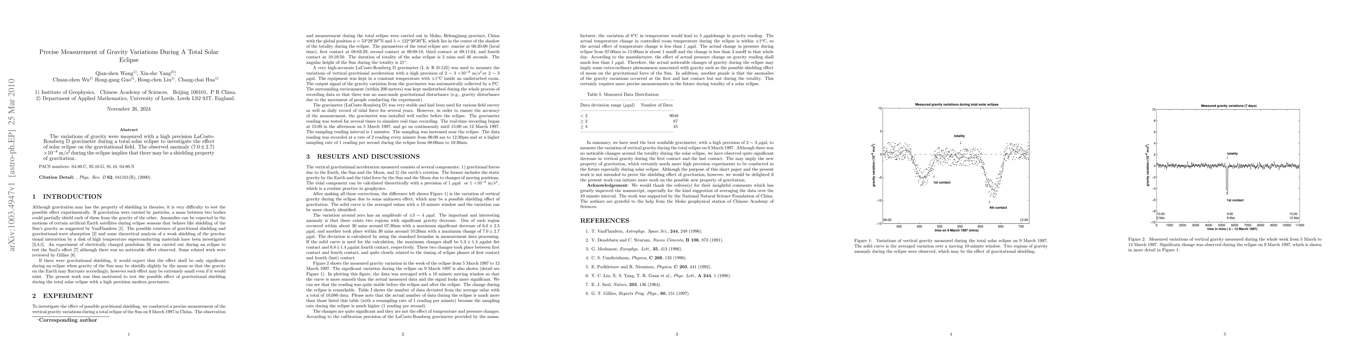 This study precisely measured gravity variations using a LaCoste-Romberg D gravimeter during a total solar eclipse, revealing an anomaly of $(7.0 \pm 2.7) \times 10^{-8}$ m/s$^2$, suggesting a possible gravitational shielding effect.