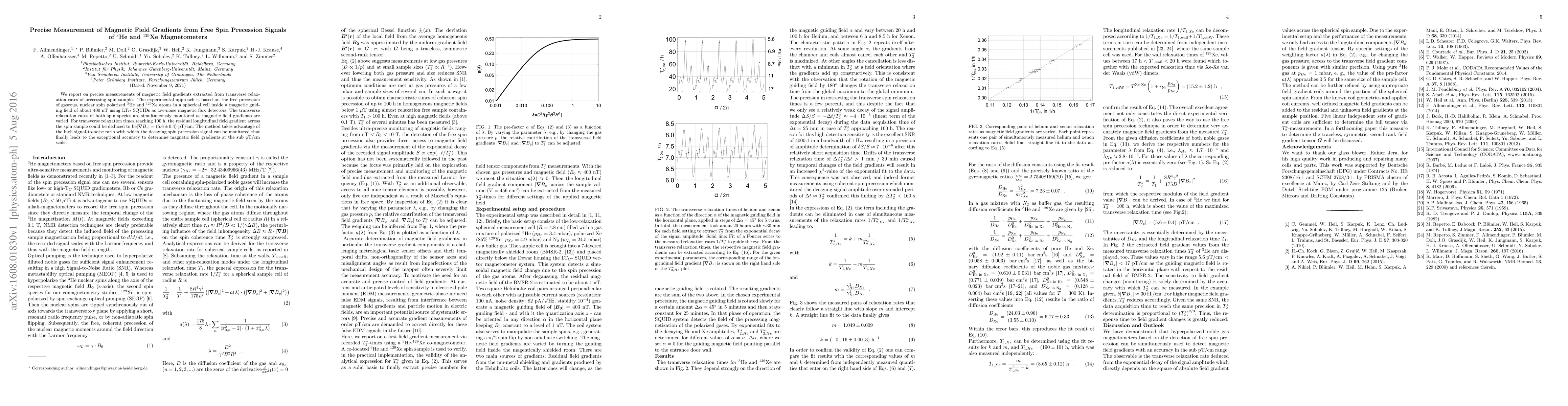 This paper presents a method for precise measurement of magnetic field gradients using the free precession of nuclear spin polarized $^3$He and $^{129}$Xe atoms, achieving an accuracy of $|\vec{\nabla}B_z|=(5.6 \pm 0.4)$ pT/cm with LT$_C$ SQUIDs as detectors. The technique leverages the high signal-to-noise ratio of the decaying spin precession signal.
