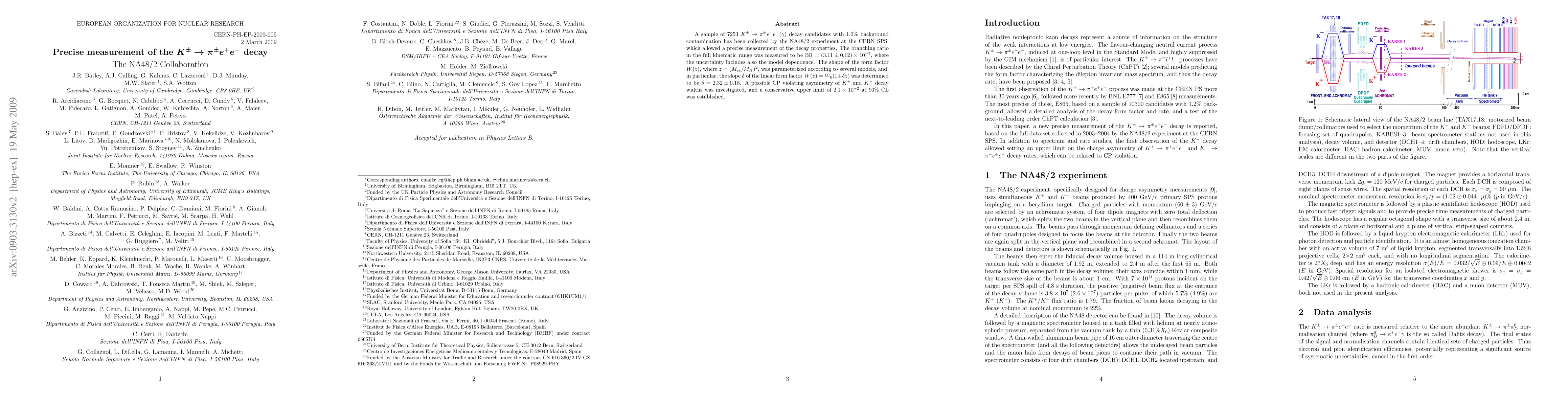 The NA48/2 experiment at CERN SPS measured the branching ratio of the $K^\pm\to\pi^\pm e^+e^-$ decay to $(3.11\pm0.12)\times 10^{-7}$, determining the slope of the form factor and establishing a conservative upper limit for CP violation asymmetry.