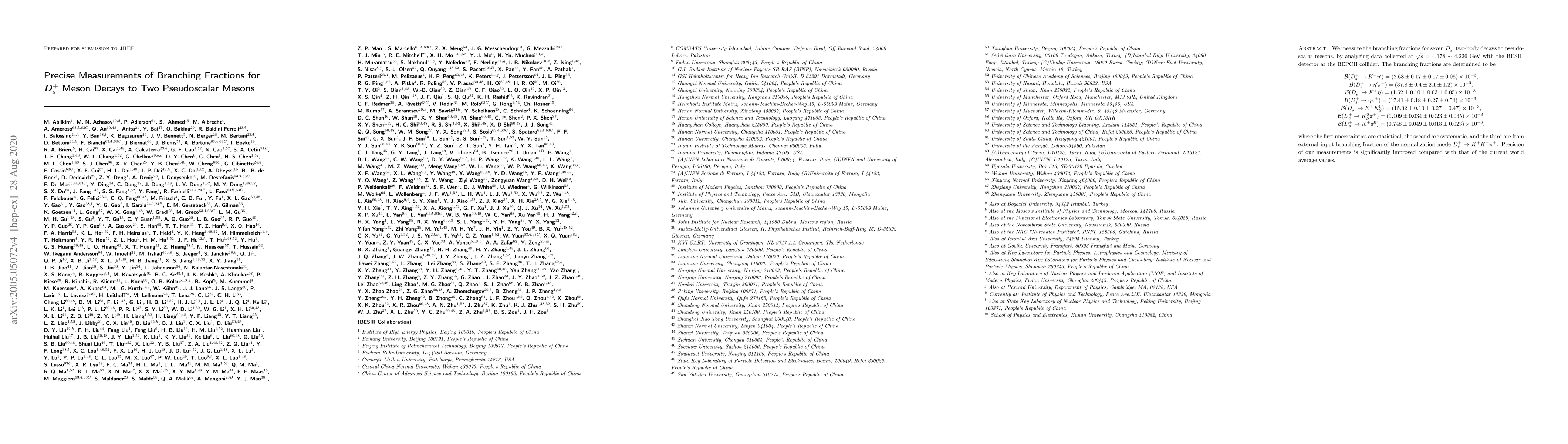 This paper reports precise measurements of branching fractions for seven $D_s^+$ meson decays to two pseudoscalar mesons, using data from the BESIII detector at the BEPCII collider. The results show significant improvements in precision over previous world averages.