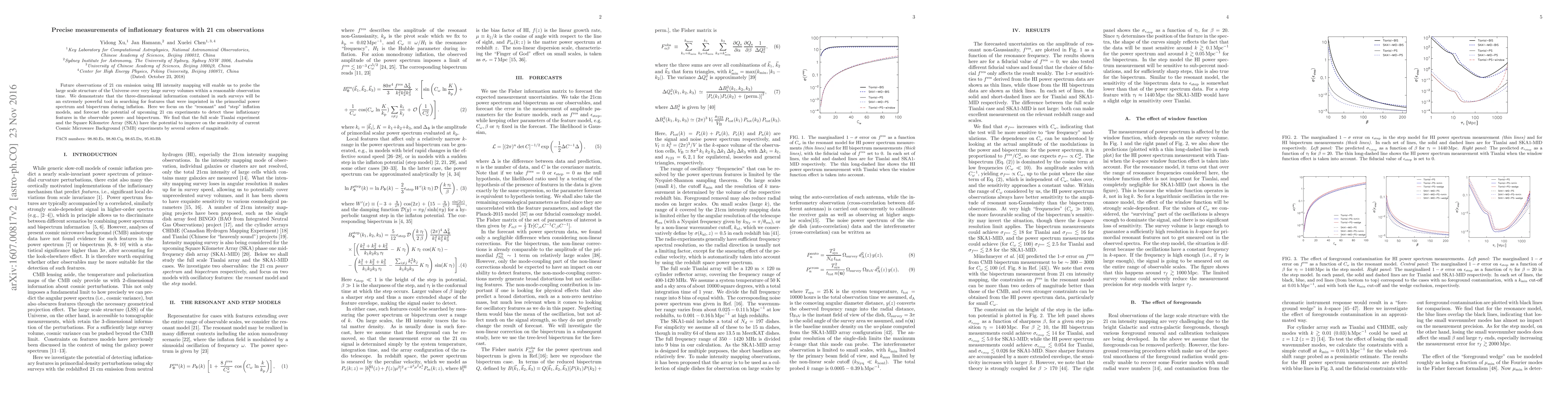 Future observations of 21~cm emission using HI intensity mapping will enable us to probe the large scale structure of the Universe over very large survey volumes within a reasonable observation time. We demonstrate that the three-dimensional information contained in such surveys will be an extremely powerful tool in searching for features that were imprinted in the primordial power spectrum and bispectrum during inflation. Here we focus on the "resonant" and "step" inflation models, and forecast the potential of upcoming 21~cm experiments to detect these inflationary features in the observable power- and bispectrum. We find that the full scale Tianlai experiment and the Square Kilometre Array (SKA) have the potential to improve on the sensitivity of current Cosmic Microwave Background (CMB) experiments by several orders of magnitude.