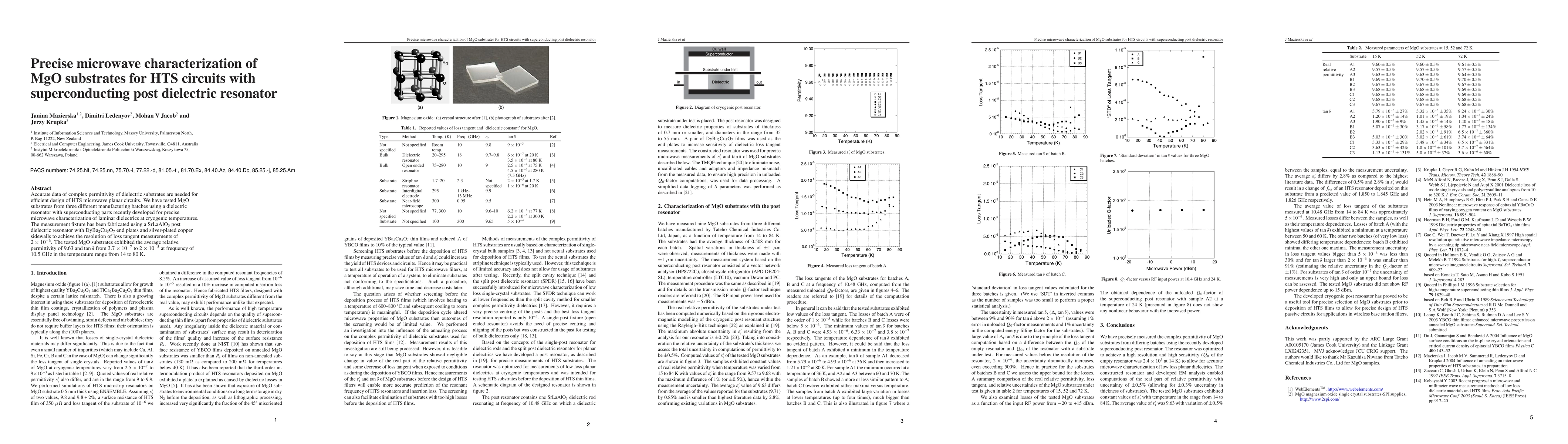 Accurate data of complex permittivity of dielectric substrates are needed for efficient design of HTS microwave planar circuits. We have tested MgO substrates from three different manufacturing batches using a dielectric resonator with superconducting parts recently developed for precise microwave characterization of laminar dielectrics at cryogenic temperatures. The measurement fixture has been fabricated using a SrLaAlO3 post dielectric resonator with DyBa2Cu3O7 end plates and silver-plated copper sidewalls to achieve the resolution of loss tangent measurements of 2 {\times} 10-6. The tested MgO substrates exhibited the average relative permittivity of 9.63 and tan {\delta} from 3.7 {\times} 10-7 to 2 {\times} 10-5 at frequency of 10.5 GHz in the temperature range from 14 to 80 K.