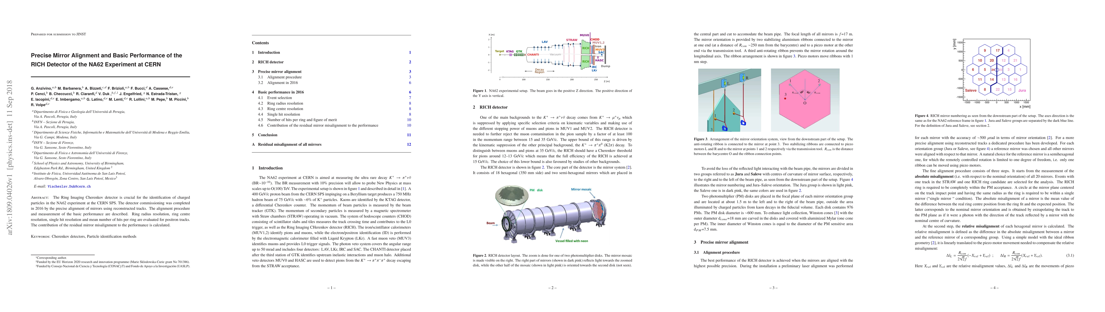 The paper details the alignment of mirrors in the Ring Imaging Cherenkov (RICH) detector for the NA62 experiment at CERN, crucial for charged particle identification. Key performance metrics like ring radius and centre resolutions, single hit resolution, and average hits per ring were evaluated for positron tracks, quantifying the impact of residual mirror misalignment on performance.
