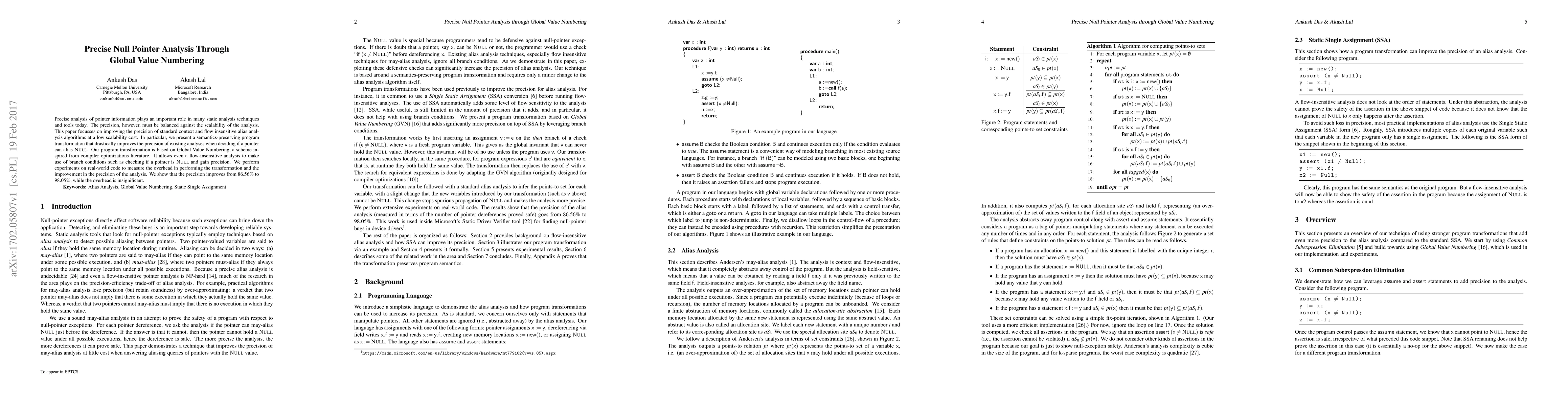 This paper presents a program transformation using Global Value Numbering to enhance the precision of null pointer analysis in static analysis tools, achieving a significant improvement from 86.56% to 98.05% with minimal scalability overhead.