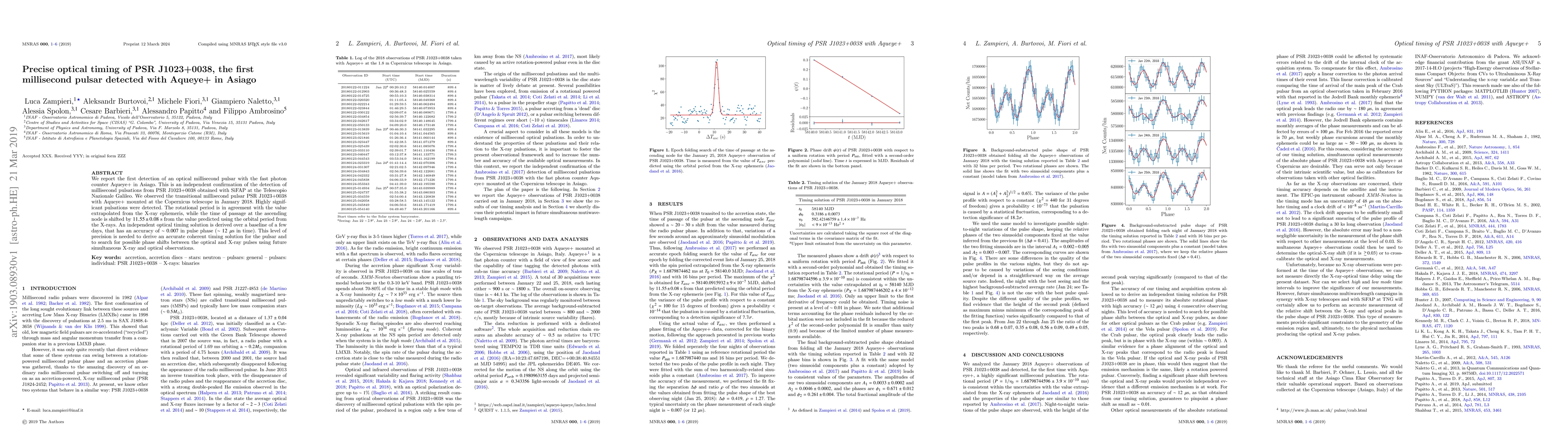 This paper reports the first optical detection of the millisecond pulsar PSR J1023+0038 using the Aqueye+ photon counter in Asiago, confirming its pulsations detected via X-rays. The study achieved precise optical timing with an accuracy of ~0.007 in pulse phase, essential for future coherent timing and potential phase shift studies between optical and X-ray pulses.