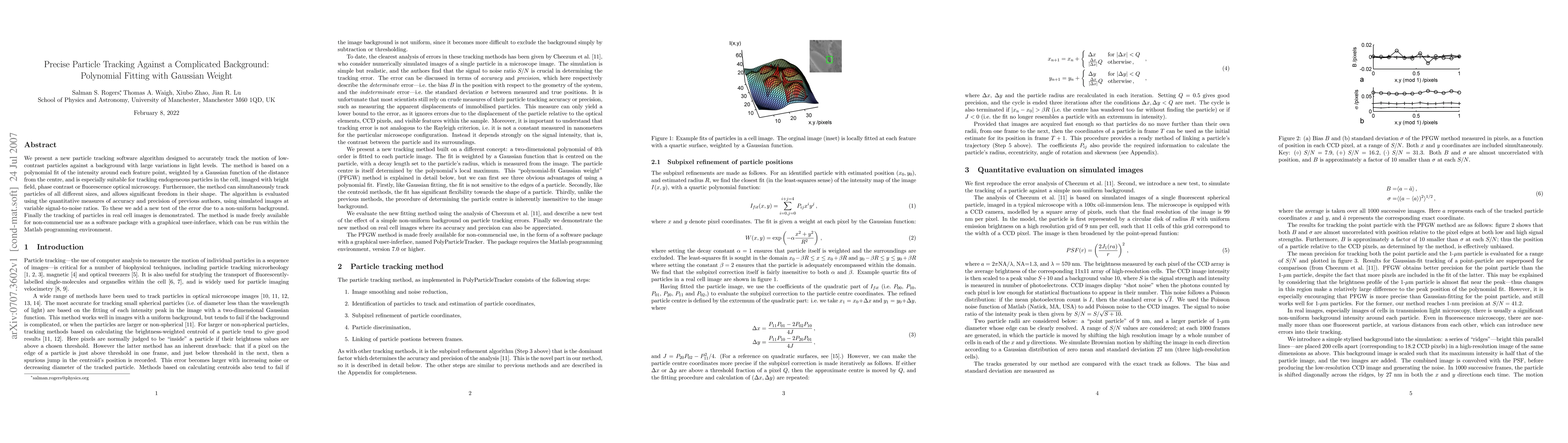 We present a new particle tracking software algorithm designed to accurately track the motion of low-contrast particles against a background with large variations in light levels. The method is based on a polynomial fit of the intensity around each feature point, weighted by a Gaussian function of the distance from the centre, and is especially suitable for tracking endogeneous particles in the cell, imaged with bright field, phase contrast or fluorescence optical microscopy. Furthermore, the method can simultaneously track particles of all different sizes, and allows significant freedom in their shape. The algorithm is evaluated using the quantitative measures of accuracy and precision of previous authors, using simulated images at variable signal-to-noise ratios. To these we add a new test of the error due to a non-uniform background. Finally the tracking of particles in real cell images is demonstrated. The method is made freely available for non-commencial use as a software package with a graphical user-inferface, which can be run within the Matlab programming environment.