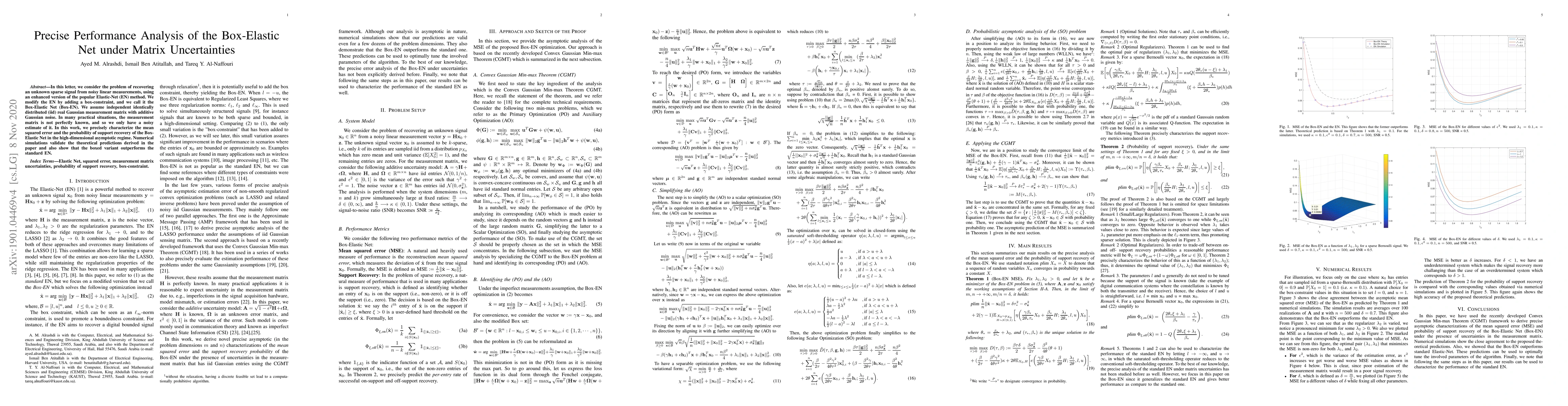 In this letter, we consider the problem of recovering an unknown sparse signal from noisy linear measurements, using an enhanced version of the popular Elastic-Net (EN) method. We modify the EN by adding a box-constraint, and we call it the Box-Elastic Net (Box-EN). We assume independent identically distributed (iid) real Gaussian measurement matrix with additive Gaussian noise. In many practical situations, the measurement matrix is not perfectly known, and so we only have a noisy estimate of it. In this work, we precisely characterize the mean squared error and the probability of support recovery of the Box-Elastic Net in the high-dimensional asymptotic regime. Numerical simulations validate the theoretical predictions derived in the paper and also show that the boxed variant outperforms the standard EN.