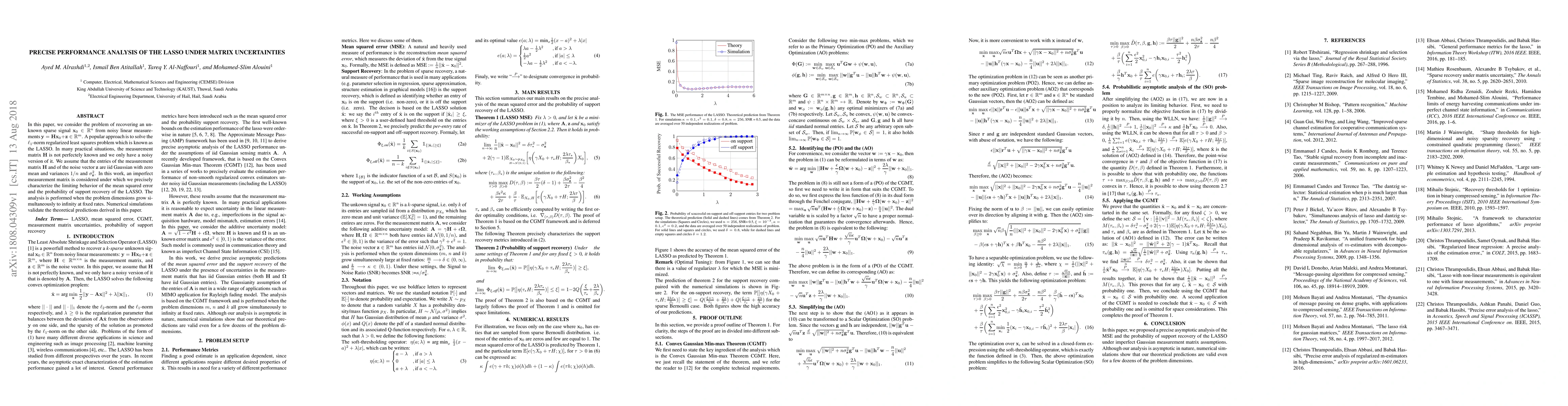 In this paper, we consider the problem of recovering an unknown sparse signal $\xv_0 \in \mathbb{R}^n$ from noisy linear measurements $\yv = \Hm \xv_0+ \zv \in \mathbb{R}^m$. A popular approach is to solve the $\ell_1$-norm regularized least squares problem which is known as the LASSO. In many practical situations, the measurement matrix $\Hm$ is not perfectely known and we only have a noisy version of it. We assume that the entries of the measurement matrix $\Hm$ and of the noise vector $\zv$ are iid Gaussian with zero mean and variances $1/n$ and $\sigma_{\zv}^2$. In this work, an imperfect measurement matrix is considered under which we precisely characterize the limiting behavior of the mean squared error and the probability of support recovery of the LASSO. The analysis is performed when the problem dimensions grow simultaneously to infinity at fixed rates. Numerical simulations validate the theoretical predictions derived in this paper.