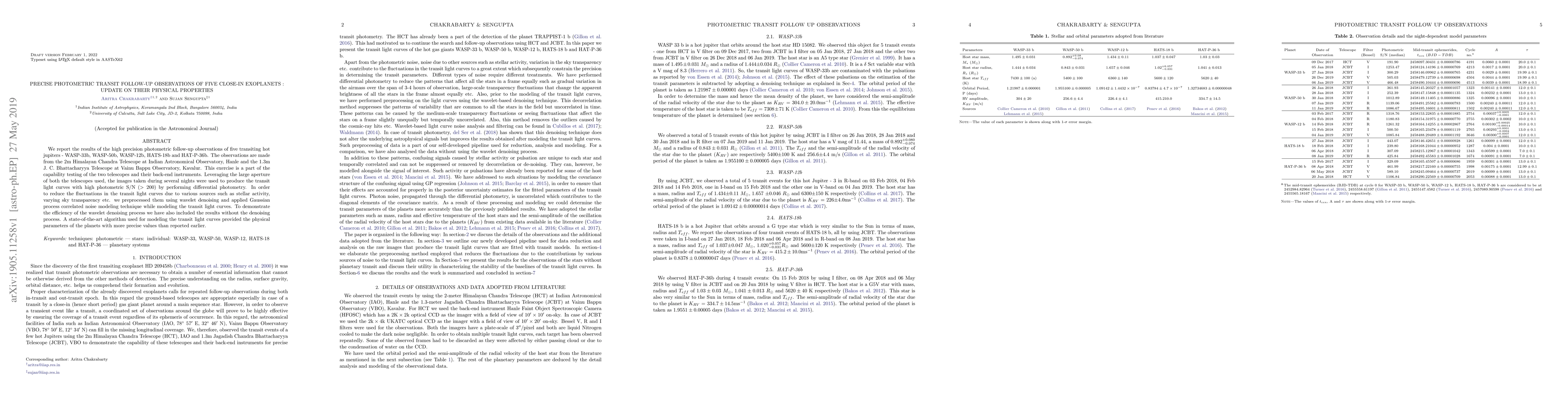 We report the results of the high precision photometric follow-up observations of five transiting hot jupiters - WASP-33b, WASP-50b, WASP-12b, HATS-18b and HAT-P-36b. The observations are made from the 2m Himalayan Chandra Telescope at Indian Astronomical Observatory, Hanle and the 1.3m J. C. Bhattacharyya Telescope at Vainu Bappu Observatory, Kavalur. This exercise is a part of the capability testing of the two telescopes and their back-end instruments. Leveraging the large aperture of both the telescopes used, the images taken during several nights were used to produce the transit light curves with high photometric S/N ($>200$) by performing differential photometry. In order to reduce the fluctuations in the transit light curves due to various sources such as stellar activity, varying sky transparency etc. we preprocessed them using wavelet denoising and applied Gaussian process correlated noise modeling technique while modeling the transit light curves. To demonstrate the efficiency of the wavelet denoising process we have also included the results without the denoising process. A state-of-the-art algorithm used for modeling the transit light curves provided the physical parameters of the planets with more precise values than reported earlier.