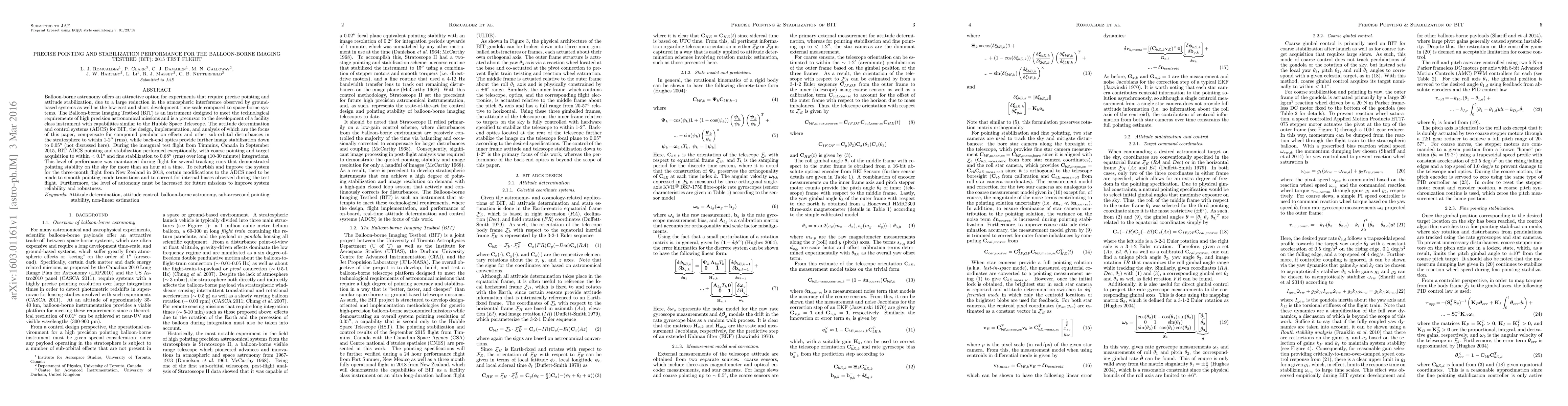 This paper details the precise pointing and stabilization performance of the Balloon-borne Imaging Testbed (BIT) during its inaugural 2015 test flight, demonstrating exceptional ADCS performance with coarse pointing to < 0.1° and fine stabilization to 0.68′′ (rms). Future enhancements aim to refine transitions and correct biases for upcoming longer missions.