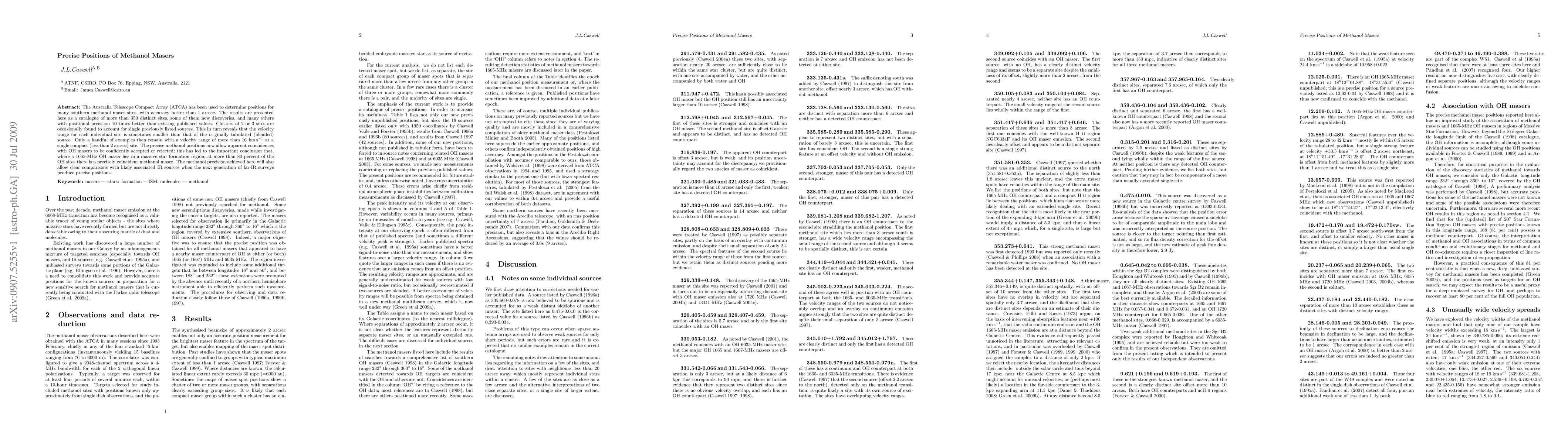 The Australia Telescope Compact Array (ATCA) has been used to determine positions for many southern methanol maser sites, with accuracy better than 1 arcsec. The results are presented here as a catalogue of more than 350 distinct sites, some of them new discoveries, and many others with positional precision 10 times better than existing published values. Clusters of 2 or 3 sites are occasionally found to account for single previously listed sources. This in turn reveals that the velocity range for each individual site is sometimes smaller than that of the originally tabulated (blended) source. Only a handful of examples then remain with a velocity range of more than 16 km/s at a single compact (less than 2 arcsec) site. The precise methanol positions now allow apparent coincidences with OH masers to be confidently accepted or rejected; this has led to the important conclusion that, where a 1665-MHz OH maser lies in a massive star formation region, at more than 80 percent of the OH sites there is a precisely coincident methanol maser. The methanol precision achieved here will also allow clear comparisons with likely associated IR sources when the next generation of far-IR surveys produce precise positions.