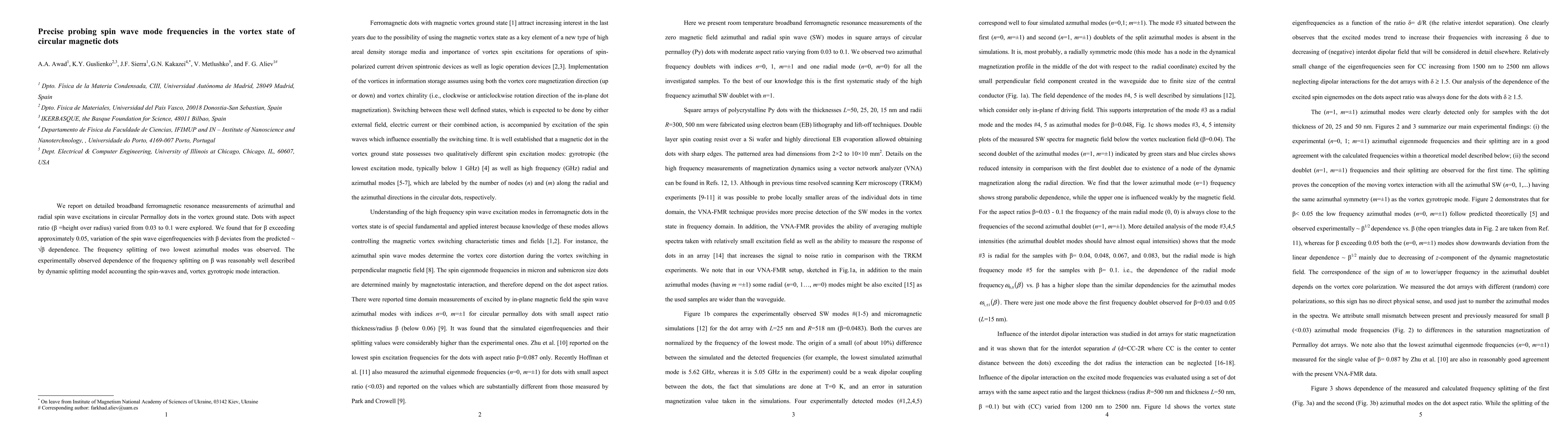 We report on detailed broadband ferromagnetic resonance measurements of azimuthal and radial spin wave excitations in circular Permalloy dots in the vortex ground state. Dots with aspect ratio (Beta =height over radius) varied from 0.03 to 0.1 were explored. We found that for Beta exceeding approximately 0.05, variation of the spin wave eigenfrequencies with Beta deviates from the predicted dependence. The frequency splitting of two lowest azimuthal modes was observed. The experimentally observed dependence of the frequency splitting on beta was reasonably well described by dynamic splitting model accounting the spin-waves and, vortex gyrotropic mode interaction.