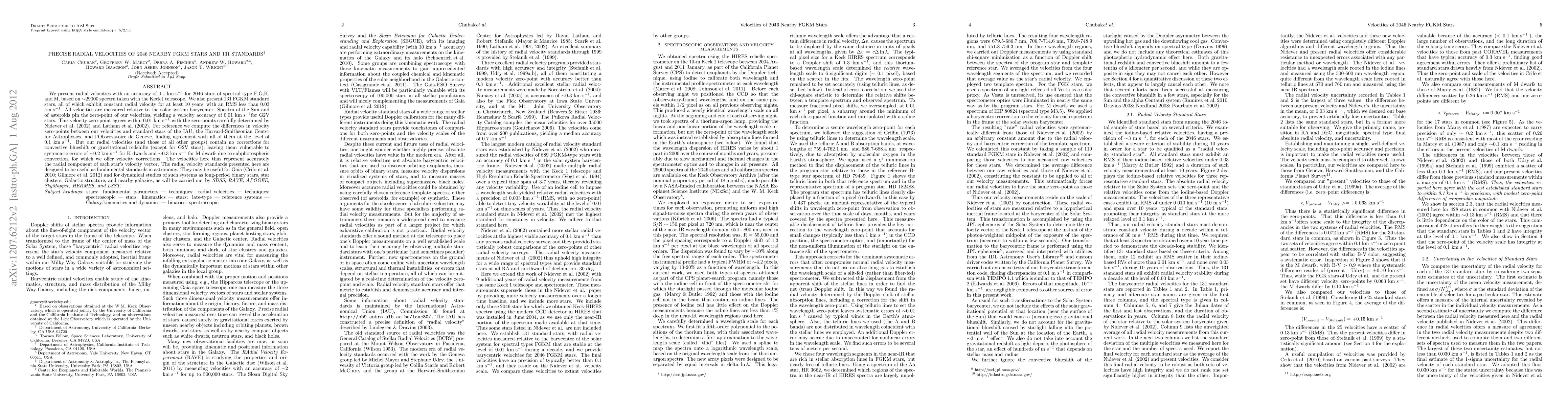 This paper provides precise radial velocities for 2046 nearby FGKM stars and 131 standard stars, measured with an accuracy of 0.1 km/s using the Keck I telescope. The radial velocity standards are stable and can serve as fundamental references for future astronomical studies, including Gaia and other surveys.