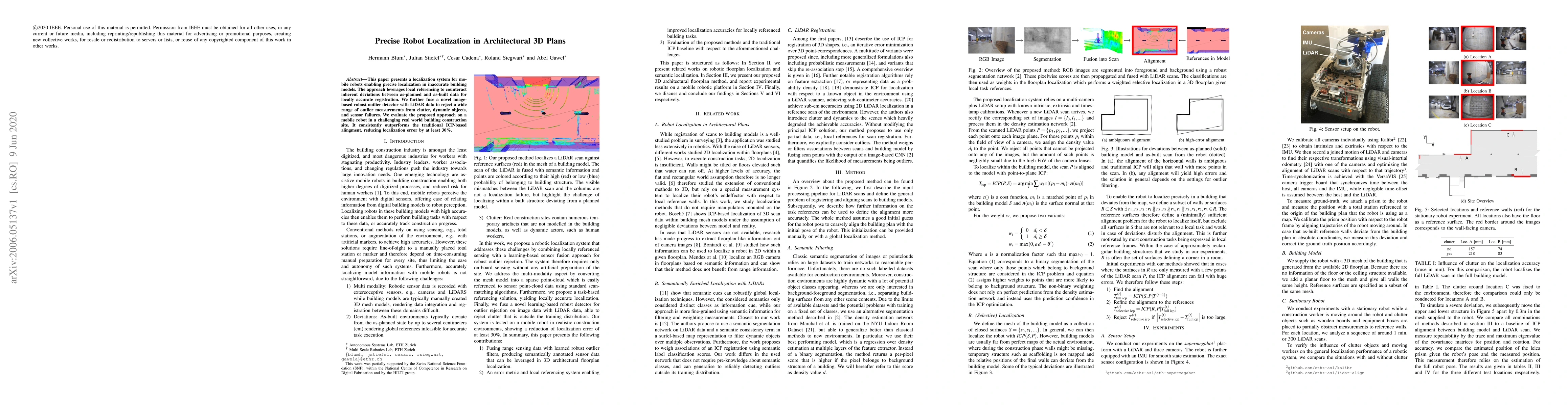 This paper presents a localization system for mobile robots enabling precise localization in inaccurate building models. The approach leverages local referencing to counteract inherent deviations between as-planned and as-built data for locally accurate registration. We further fuse a novel image-based robust outlier detector with LiDAR data to reject a wide range of outlier measurements from clutter, dynamic objects, and sensor failures. We evaluate the proposed approach on a mobile robot in a challenging real world building construction site. It consistently outperforms the traditional ICP-based alingment, reducing localization error by at least 30%.