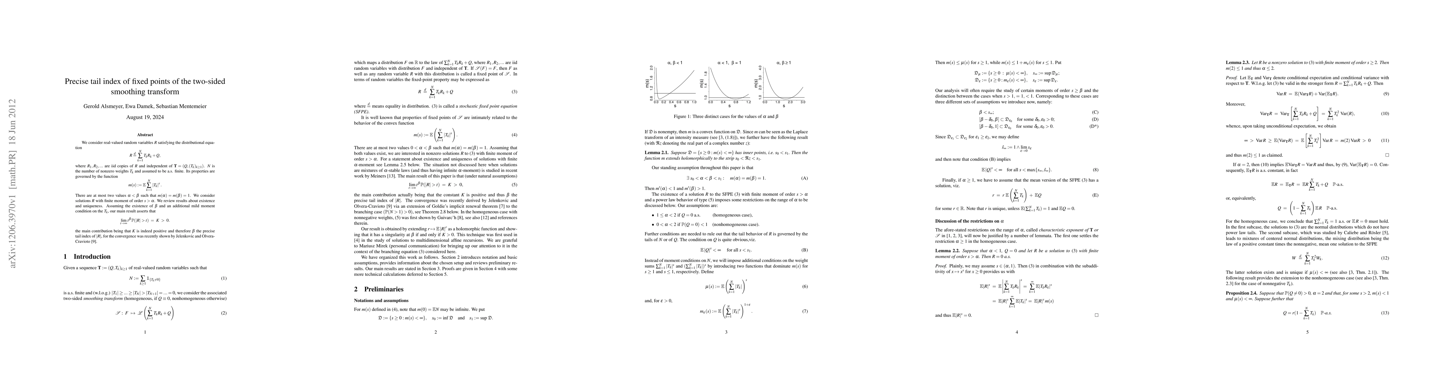 We consider real-valued random variables R satisfying the distributional equation R \eqdist \sum_{k=1}^{N}T_k R_k + Q, where R_1,R_2,... are iid copies of R and independent of T=(Q, (T_k)_{k \ge 1}). N is the number of nonzero weights T_k and assumed to be a.s. finite. Its properties are governed by the function m(s) := \E \sum_{k=1}^N |T_k|^s . There are at most two values \alpha < \beta such that m(\alpha)=m(\beta)=1. We consider solutions R with finite moment of order s > \alpha. We review results about existence and uniqueness. Assuming the existence of \beta and an additional mild moment condition on the T_{k}, our main result asserts that \lim_{t \to \infty} t^\beta P(|R| > t) = K > 0, the main contribution being that K is indeed positive and therefore \beta the precise tail index of |R|, for the convergence was recently shown by Jelenkovic and Olvera-Cravioto (arXiv:1012.2165).
