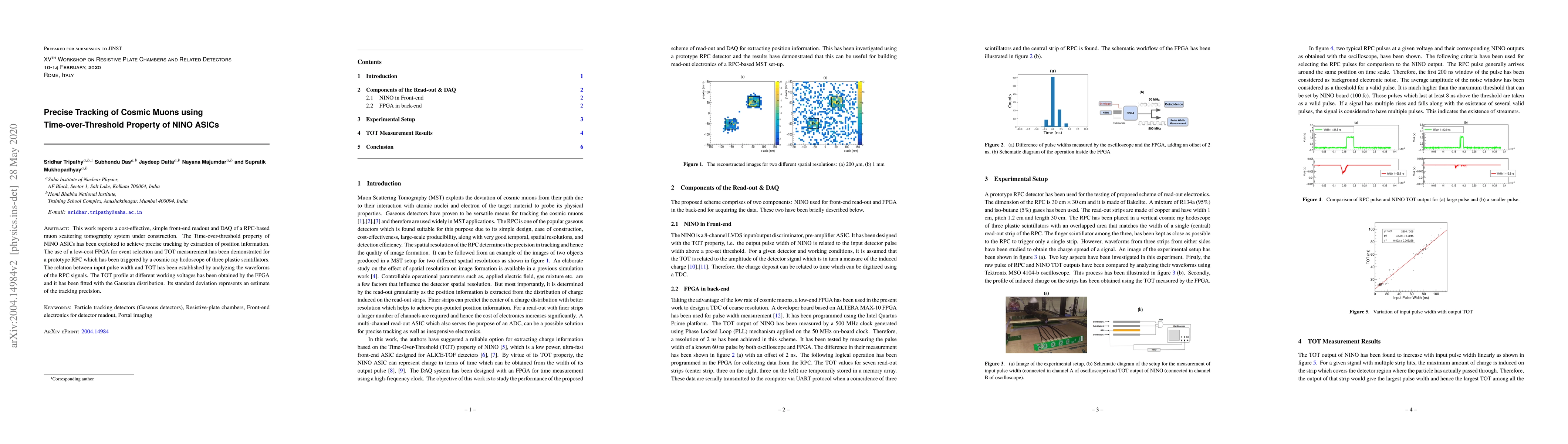 This research demonstrates a cost-effective muon tracking system using NINO ASICs' Time-over-threshold property. A prototype RPC (Resistive Plate Chamber) triggered by a cosmic ray hodoscope was employed, with an FPGA for event selection and TOT (Time-over-threshold) measurement. A correlation between input pulse width and TOT was established, and the TOT profile's Gaussian distribution standard deviation was used to estimate tracking precision.