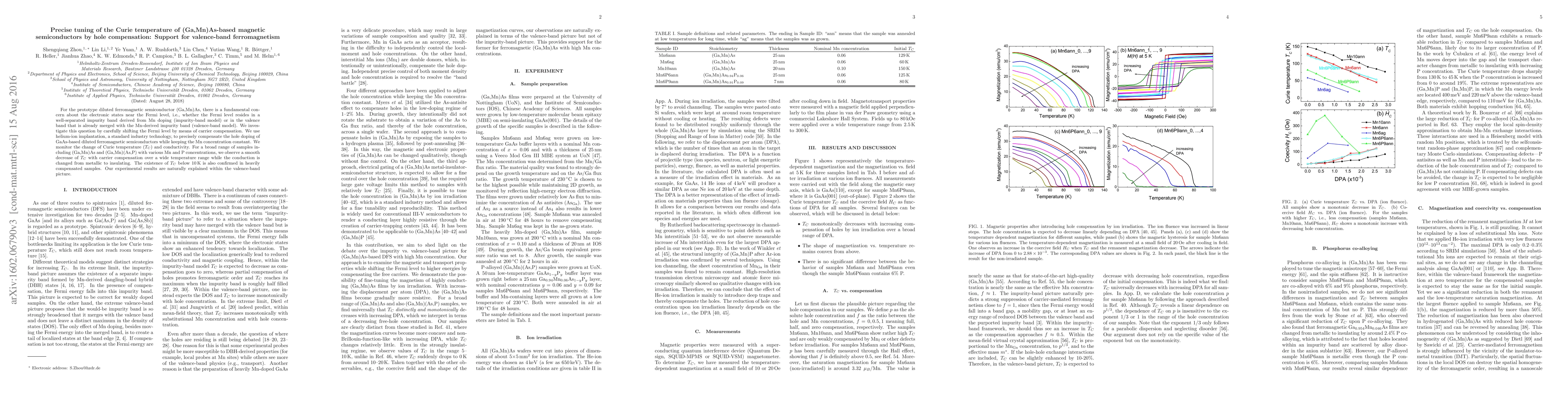 This study investigates the Curie temperature ($T_C$) tuning in (Ga,Mn)As-based magnetic semiconductors via hole compensation using helium-ion implantation, confirming the valence-band model for ferromagnetism as $T_C$ decreases smoothly with carrier compensation.