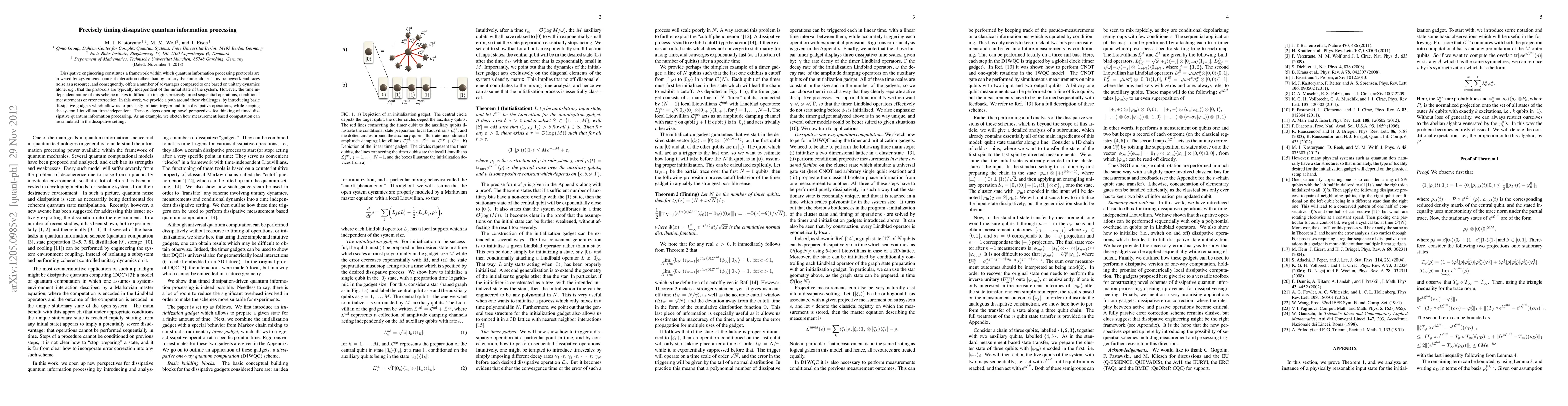 Dissipative engineering constitutes a framework within which quantum information processing protocols are powered by system-environment interaction rather than by unitary dynamics alone. This framework embraces noise as a resource, and consequently, offers a number of advantages compared to one based on unitary dynamics alone, e.g., that the protocols are typically independent of the initial state of the system. However, the time independent nature of this scheme makes it difficult to imagine precisely timed sequential operations, conditional measurements or error correction. In this work, we provide a path around these challenges, by introducing basic dissipative gadgets which allow us to precisely initiate, trigger and time dissipative operations, while keeping the system Liouvillian time-independent. These gadgets open up novel perspectives for thinking of timed dissipative quantum information processing. As an example, we sketch how measurement based computation can be simulated in the dissipative setting.