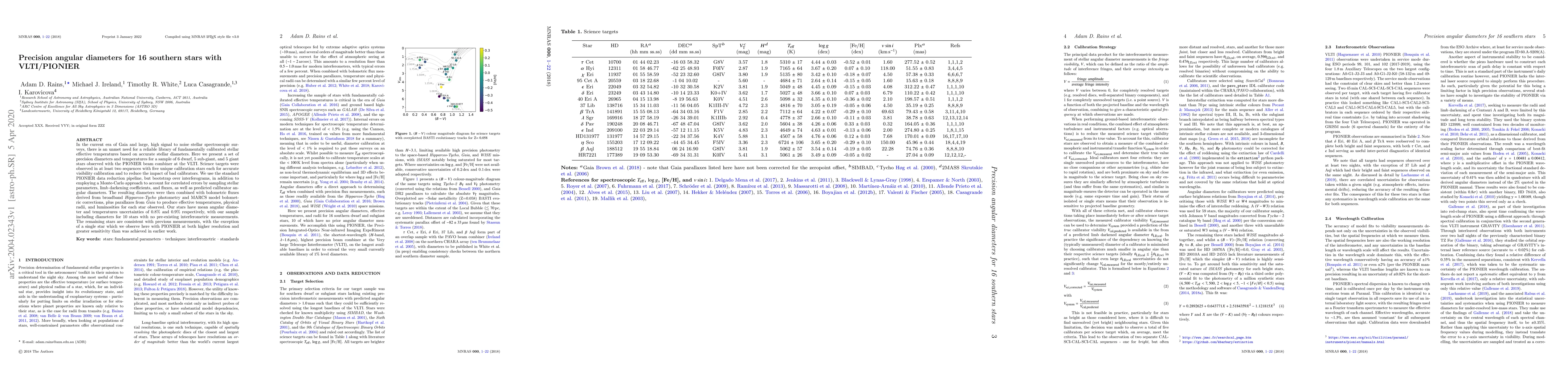 In the current era of Gaia and large, high signal to noise stellar spectroscopic surveys, there is an unmet need for a reliable library of fundamentally calibrated stellar effective temperatures based on accurate stellar diameters. Here we present a set of precision diameters and temperatures for a sample of 6 dwarf, 5 sub-giant, and 5 giant stars observed with the PIONIER beam combiner at the VLTI. Science targets were observed in at least two sequences with five unique calibration stars each for accurate visibility calibration and to reduce the impact of bad calibrators. We use the standard PIONIER data reduction pipeline, but bootstrap over interferograms, in addition to employing a Monte-Carlo approach to account for correlated errors by sampling stellar parameters, limb darkening coefficients, and fluxes, as well as predicted calibrator angular diameters. The resulting diameters were then combined with bolometric fluxes derived from broadband Hipparcos-Tycho photometry and MARCS model bolometric corrections, plus parallaxes from Gaia to produce effective temperatures, physical radii, and luminosities for each star observed. Our stars have mean angular diameter and temperatures uncertainties of 0.8% and 0.9% respectively, with our sample including diameters for 10 stars with no pre-existing interferometric measurements. The remaining stars are consistent with previous measurements, with the exception of a single star which we observe here with PIONIER at both higher resolution and greater sensitivity than was achieved in earlier work.