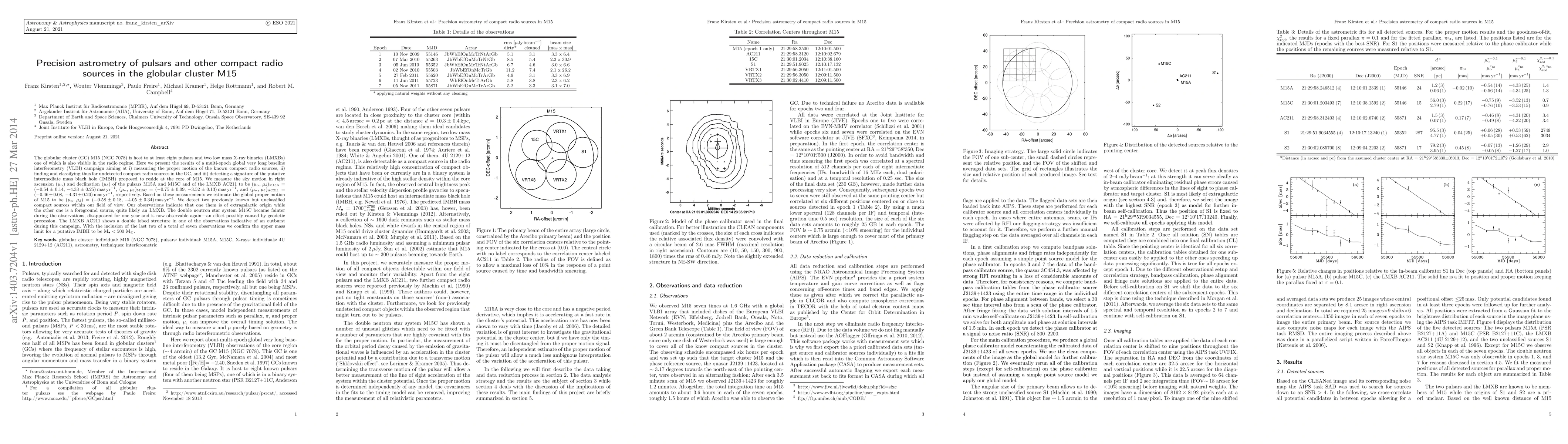 The globular cluster (GC) M15 (NGC 7078) is host to at least eight pulsars and two low mass X-ray binaries (LMXBs) one of which is also visible in the radio regime. Here we present the results of a multi-epoch global very long baseline interferometry (VLBI) campaign aiming at i) measuring the proper motion of the known compact radio sources, ii) finding and classifying thus far undetected compact radio sources in the GC, and iii) detecting a signature of the putative intermediate mass black hole (IMBH) proposed to reside at the core of M15. We measure the sky motion in right ascension ($\mu_{\alpha}$) and declination ($\mu_{\delta}$) of the pulsars M15A and M15C and of the LMXB AC211 to be $(\mu_{\alpha},\,\mu_{\delta})_{\text{M15A}}=(-0.54\pm0.14,\,-4.33\pm0.25)\,$mas$\,$yr$^{-1}$, $(\mu_{\alpha},\,\mu_{\delta})_{\text{M15C}}=(-0.75\pm0.09,\,-3.52\pm0.13)\,$mas$\,$yr$^{-1}$, and $(\mu_{\alpha},\,\mu_{\delta})_{\text{AC211}}=(-0.46\pm0.08,\,-4.31\pm0.20)\,$mas$\,$yr$^{-1}$, respectively. Based on these measurements we estimate the global proper motion of M15 to be $(\mu_{\alpha},\,\mu_{\delta})=(-0.58\pm0.18,\,-4.05\pm0.34)\,$mas$\,$yr$^{-1}$. We detect two previously known but unclassified compact sources within our field of view. Our observations indicate that one them is of extragalactic origin while the other one is a foreground source, quite likely an LMXB. The double neutron star system M15C became fainter during the observations, disappeared for one year and is now observable again---an effect possibly caused by geodetic precession. The LMXB AC211 shows a double lobed structure in one of the observations indicative of an outburst during this campaign. With the inclusion of the last two of a total of seven observations we confirm the upper mass limit for a putative IMBH to be M$_{\bullet}<500$ M$_{\odot}$.