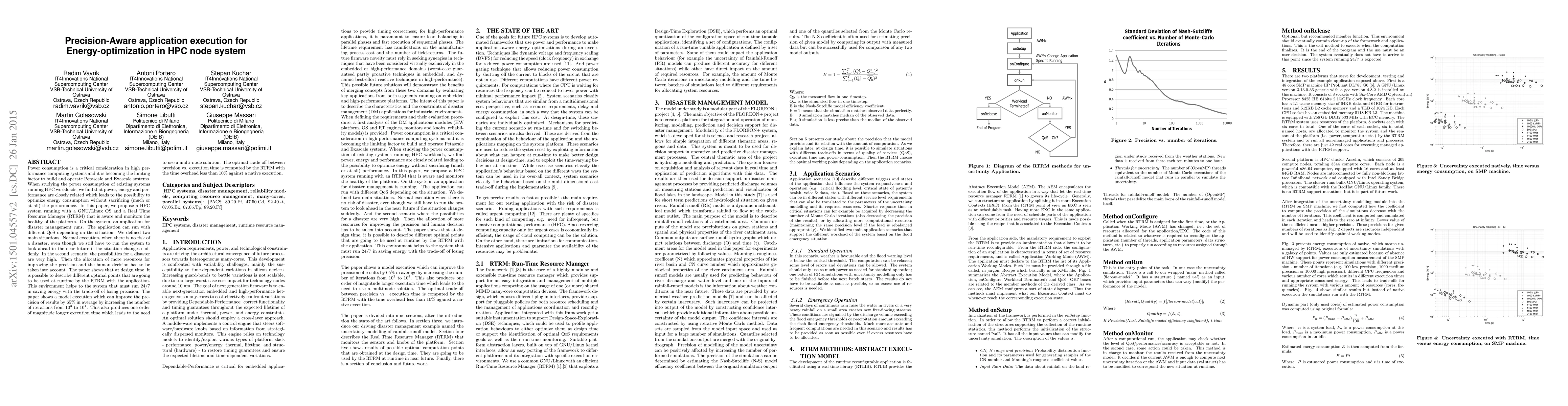 This paper proposes a precision-aware application execution model for energy optimization in high-performance computing (HPC) systems, using a Real Time Resource Manager (RTRM) on a GNU/Linux OS. It demonstrates that energy savings can be achieved without significant performance loss, especially during disaster management scenarios where precision can be adjusted based on risk levels.
