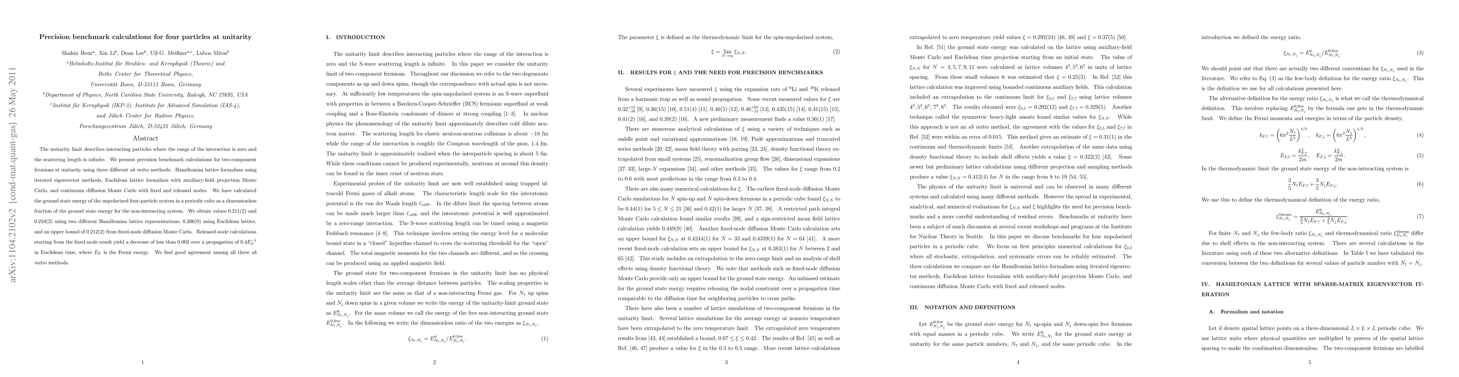 This research provides precision benchmark calculations for two-component fermions at unitarity using three ab initio methods: Hamiltonian lattice, Euclidean lattice, and diffusion Monte Carlo. Results for the ground state energy of the unpolarized four-particle system are consistent across methods, ranging from 0.206(9) to 0.212(2), indicating good agreement and reliability in these approaches.