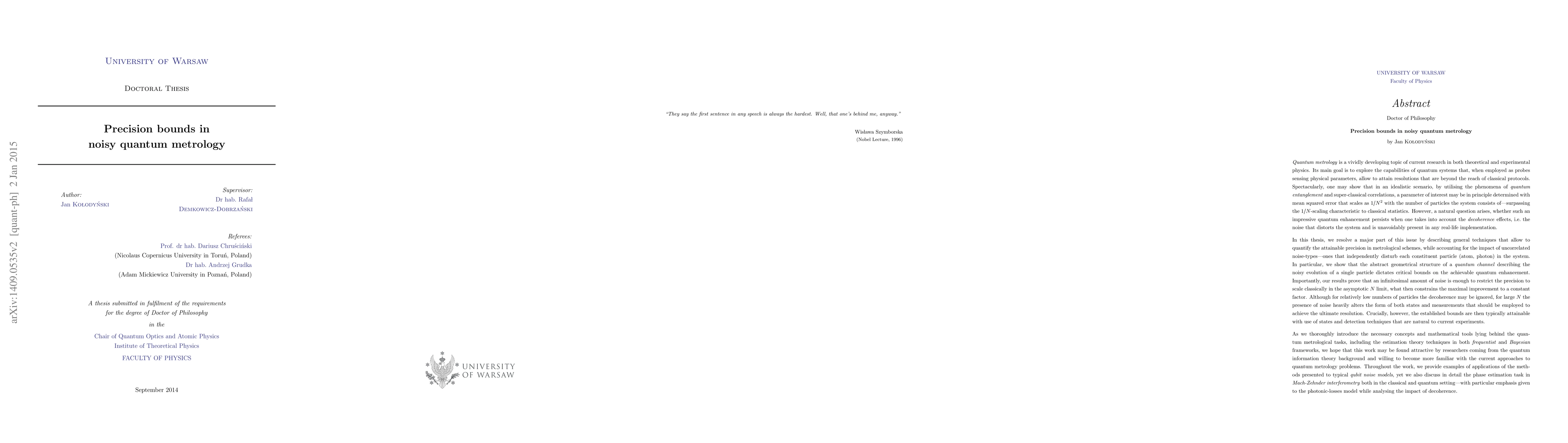 In an idealistic setting, quantum metrology protocols allow to sense physical parameters with mean squared error that scales as $1/N^2$ with the number of particles involved---substantially surpassing the $1/N$-scaling characteristic to classical statistics. A natural question arises, whether such an impressive enhancement persists when one takes into account the decoherence effects that are unavoidable in any real-life implementation. In this thesis, we resolve a major part of this issue by describing general techniques that allow to quantify the attainable precision in metrological schemes in the presence of uncorrelated noise. We show that the abstract geometrical structure of a quantum channel describing the noisy evolution of a single particle dictates then critical bounds on the ultimate quantum enhancement. Our results prove that an infinitesimal amount of noise is enough to restrict the precision to scale classically in the asymptotic $N$ limit, and thus constrain the maximal improvement to a constant factor. Although for low numbers of particles the decoherence may be ignored, for large $N$ the presence of noise heavily alters the form of both optimal states and measurements attaining the ultimate resolution. However, the established bounds are then typically achievable with use of techniques natural to current experiments. In this work, we thoroughly introduce the necessary concepts and mathematical tools lying behind metrological tasks, including both frequentist and Bayesian estimation theory frameworks. We provide examples of applications of the methods presented to typical qubit noise models, yet we also discuss in detail the phase estimation tasks in Mach-Zehnder interferometry both in the classical and quantum setting---with particular emphasis given to photonic losses while analysing the impact of decoherence.