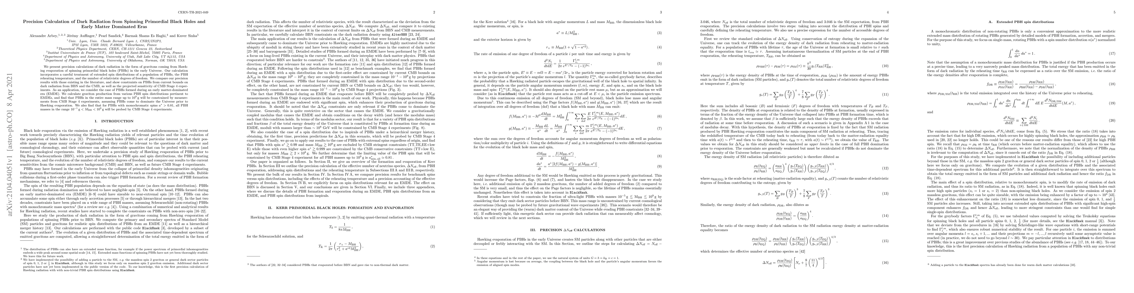 We present precision calculations of dark radiation in the form of gravitons coming from Hawking evaporation of spinning primordial black holes (PBHs) in the early Universe. Our calculation incorporates a careful treatment of extended spin distributions of a population of PBHs, the PBH reheating temperature, and the number of relativistic degrees of freedom. We compare our precision results with those existing in the literature, and show constraints on PBHs from current bounds on dark radiation from BBN and the CMB, as well as the projected sensitivity of CMB Stage 4 experiments. As an application, we consider the case of PBHs formed during an early matter-dominated era (EMDE). We calculate graviton production from various PBH spin distributions pertinent to EMDEs, and find that PBHs in the entire mass range up to $10^9\,$g will be constrained by measurements from CMB Stage 4 experiments, assuming PBHs come to dominate the Universe prior to Hawking evaporation. We also find that for PBHs with monochromatic spins $a^*>0.81$, all PBH masses in the range $10^{-1}\,{\rm g} < M_{\rm BH} <10^9\,$g will be probed by CMB Stage 4 experiments.