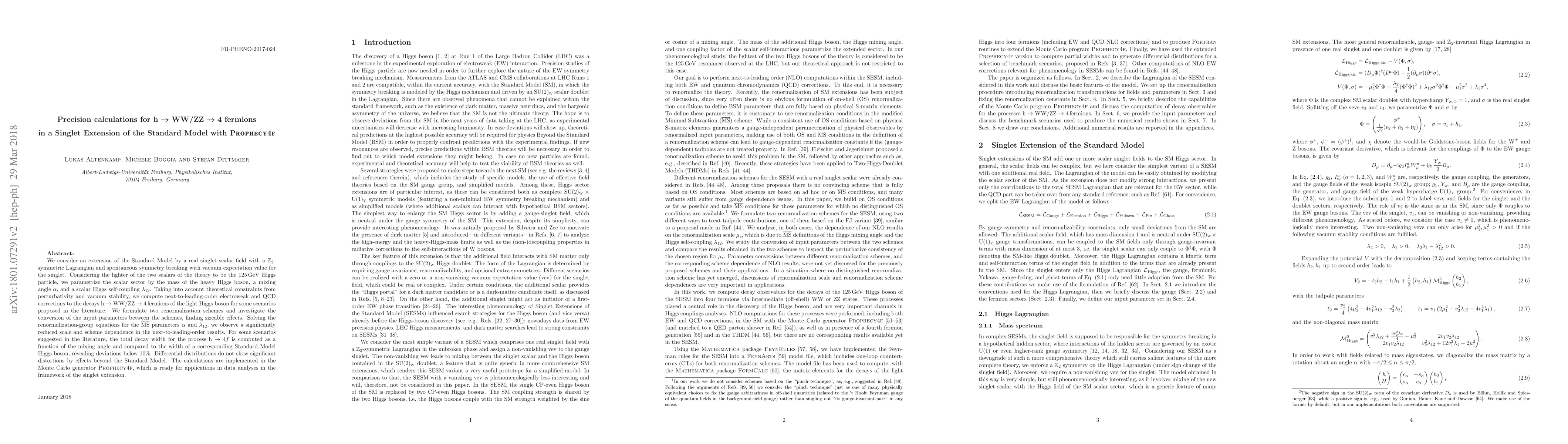 This paper investigates precision calculations for the decay of the 125GeV Higgs boson into four fermions within a singlet extension of the Standard Model, employing Prophecy4f. It computes next-to-leading-order corrections and examines the impact of different renormalization schemes, finding reduced scale and scheme dependence in the results.