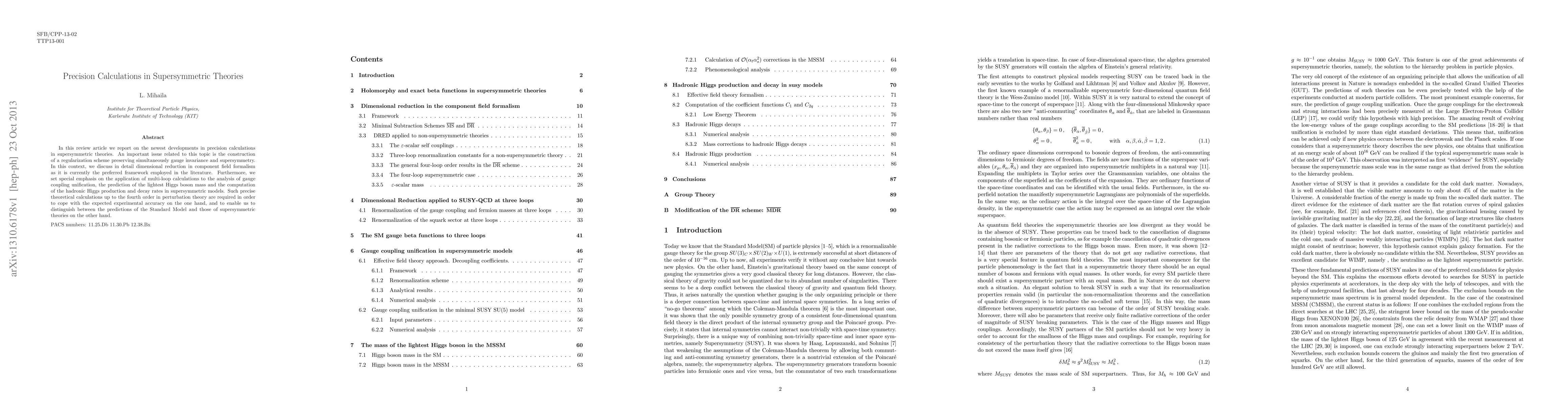 In this review article we report on the newest developments in precision calculations in supersymmetric theories. An important issue related to this topic is the construction of a regularization scheme preserving simultaneously gauge invariance and supersymmetry. In this context, we discuss in detail dimensional reduction in component field formalism as it is currently the preferred framework employed in the literature. Furthermore, we set special emphasis on the application of multi-loop calculations to the analysis of gauge coupling unification, the prediction of thelightest Higgs boson mass and the computation of the hadronic Higgs production and decay rates in supersymmetric models. Such precise theoretical calculations up to the fourth order in perturbation theory are required in order to cope with the expected experimental accuracy on the one hand, and to enable us to distinguish between the predictions of the Standard Model and those of supersymmetric theories on the other hand.