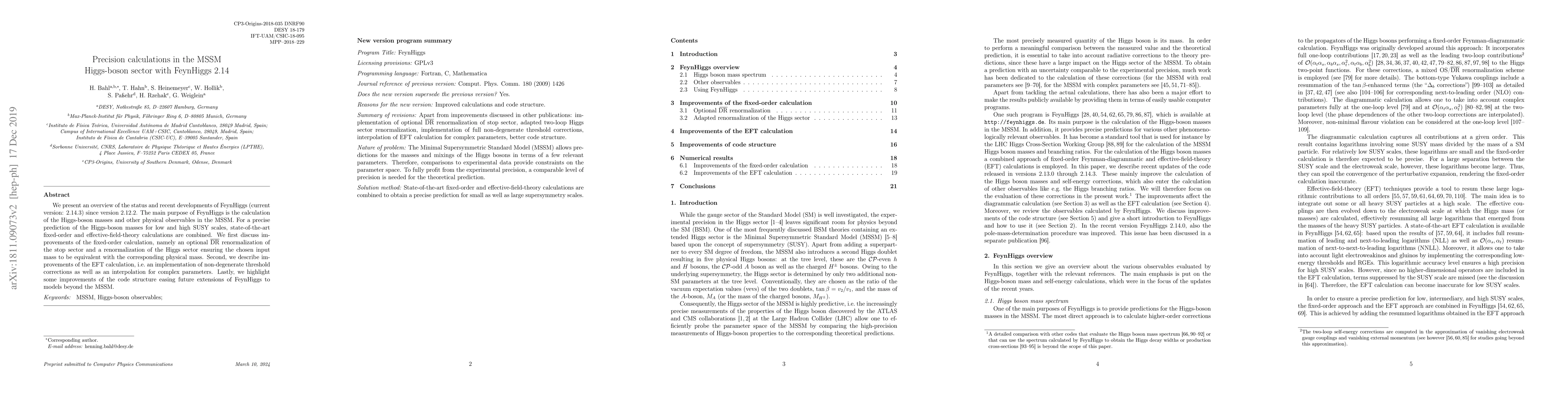 We present an overview of the status and recent developments of FeynHiggs (current version: 2.14.3) since version 2.12.2. The main purpose of FeynHiggs is the calculation of the Higgs-boson masses and other physical observables in the MSSM. For a precise prediction of the Higgs-boson masses for low and high SUSY scales, state-of-the-art fixed-order and effective-field-theory calculations are combined. We first discuss improvements of the fixed-order calculation, namely an optional $\overline{\text{DR}}$ renormalization of the stop sector and a renormalization of the Higgs sector ensuring the chosen input mass to be equivalent with the corresponding physical mass. Second, we describe improvements of the EFT calculation, i.e. an implementation of non-degenerate threshold corrections as well as an interpolation for complex parameters. Lastly, we highlight some improvements of the code structure easing future extensions of FeynHiggs to models beyond the MSSM.